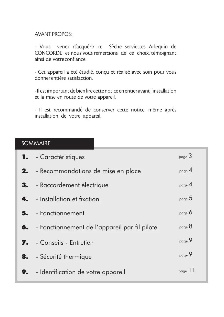 Ind. A AVANT PROPOS : - Vous venez d’acquérir ce Sèche serviettes Arlequin de CONCORDE et nous vous remercions de ce choix, témoignant ainsi de votre confiance. - Cet appareil a été étudié, conçu et réalisé avec soin pour vous donner entière satisfaction. - Il est important de bien lire cette notice en entier avant l’installation et la mise en route de votre appareil. - Il est recommandé de conserver cette notice, même après installation de votre appareil. SOMMAIRE