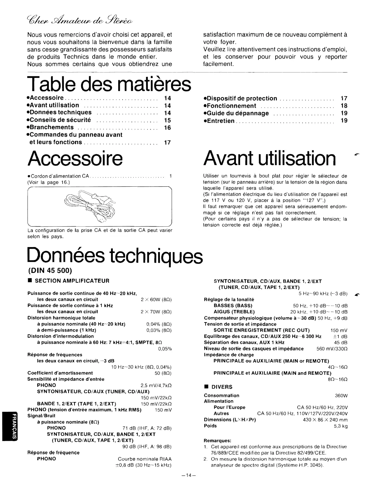 Nous vous remereions d'avoir choisi eet appareil, et nous vous souhaitons la bienvenue dans la familie sans cesse grandissante des possesseurs satisfaits de produits Technics dans Ie monde entier. Nous sommes certains que vous obtiendrez une satisfaction maximum de ce nouveau complément à votre foyer. Veuillez lire attentivement ces instructions d'emploi, et les conserver pour pouvoir vous y reporter facilement. Table des matières -Accessoire........................ "", -Avantutilisation " ... ".,." ....... , .... -Oonnées techniques ."., ... """ -Conseils de sécurité ... , .. , .. ,'.',' ... " -Branchements ."""" .. " .. , .. ,." -Commandes du panneau avant et leurs fonctions . , , . , .. , ..... , .. , .. , ....