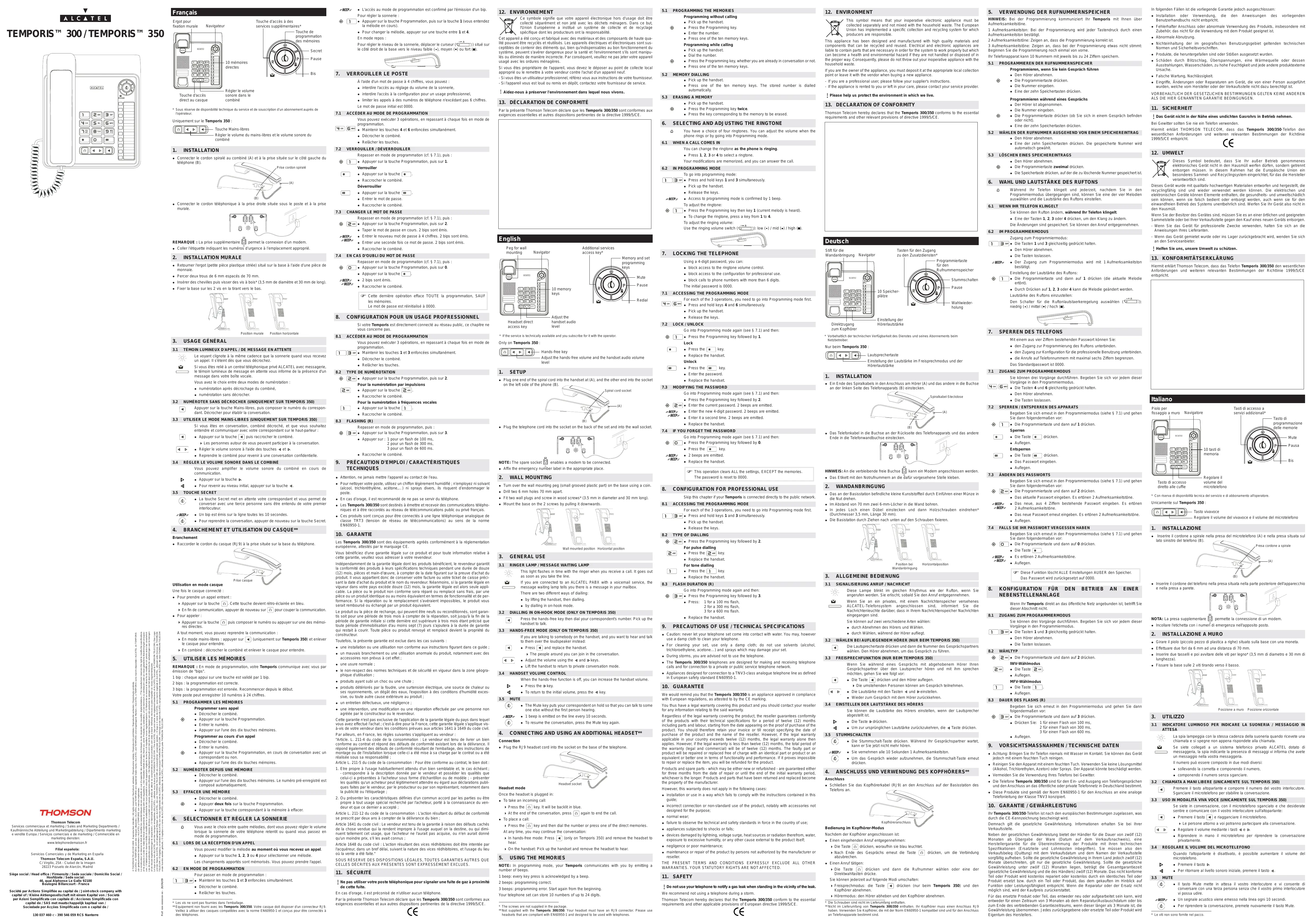 Press the Les Temporis 300/350 sont destinés à émettre et recevoir des communications téléphoniques et à être raccordés au réseau de télécommunications public ou privé français. Cette garantie n'est pas exclusive de l'application de la garantie légale du pays dans lequel vous avez effectué l'achat ; c'est-à-dire pour la France, cette garantie légale s'applique visà-vis de votre vendeur dans les conditions prévues aux articles 1641 à 1649 du code civil.
