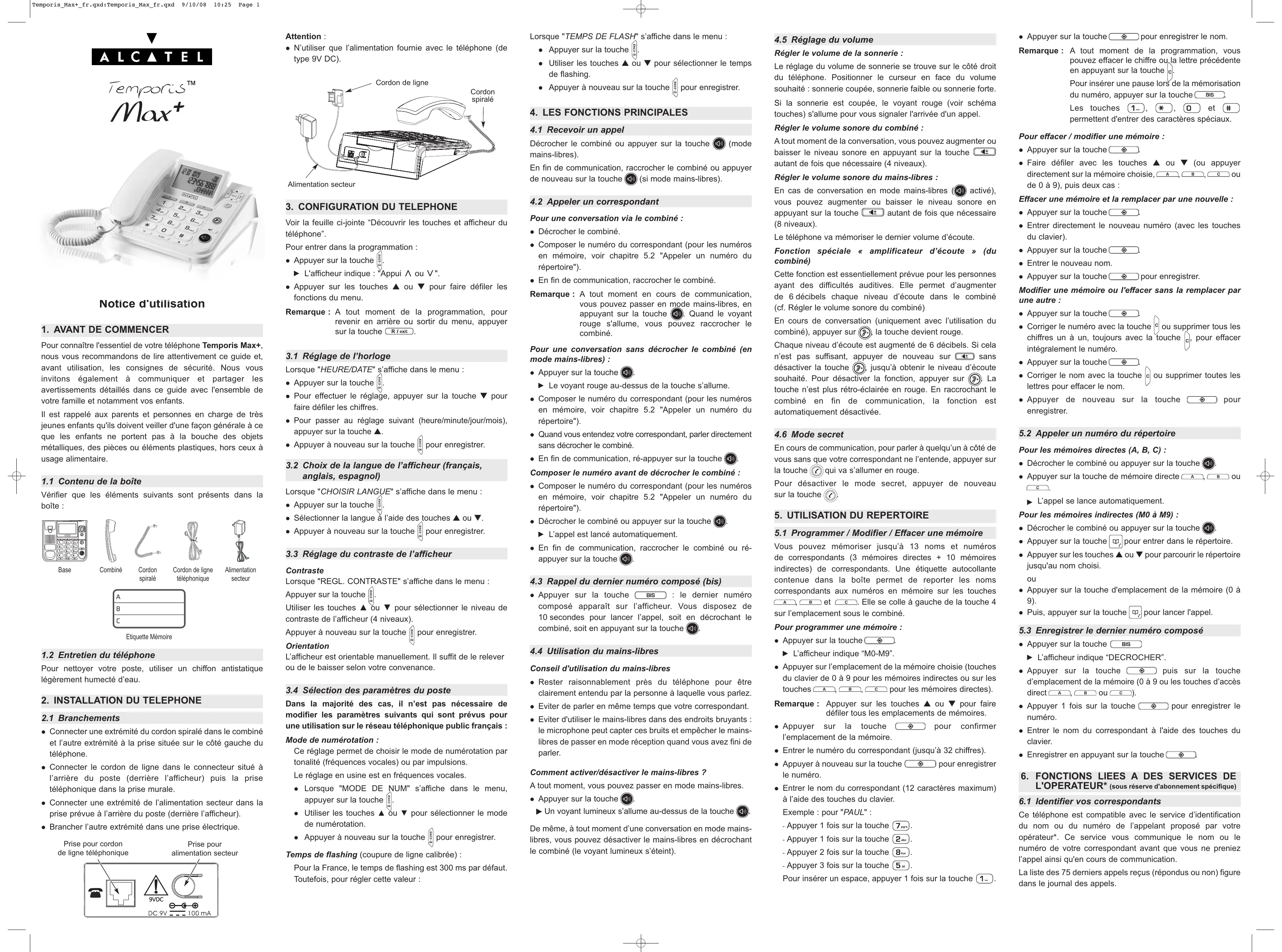 En cas de danger, l’adaptateur secteur sert de dispositif de sectionnement de l’alimentation 230 V. Il doit donc être installé, par précaution, près de l’appareil et être facilement accessible. Pour couper le dispositif de la source d’alimentation primaire, l’adaptateur secteur doit être débranché de la prise 230 V AC / 50 Hz. Le produit ou la pièce de rechange, qui peuvent être neufs ou reconditionnés, sont garantis soit pour une période de trois mois à compter de la réparation, soit jusqu’à la fin de la période de garantie initiale si cette dernière est supérieure à trois mois étant précisé que toute période d'immobilisation d'au moins sept (7) jours s'ajoutera à la durée de garantie qui restait à courir. Toute pièce ou produit renvoyé et remplacé devient la propriété du constructeur. En cas de défaillance de l’adaptateur secteur, ce dernier doit être remplacé par un modèle identique. Toutefois, la présente garantie est exclue dans les cas suivants : - une installation ou une utilisation non conforme aux instructions figurant dans ce guide ; - un mauvais branchement ou une utilisation anormale du produit, notamment avec des accessoires non prévus à cet effet ; Pour cette raison, il est recommandé d’utiliser en complément un poste téléphonique conventionnel ne nécessitant pas de courant secteur. En l’absence d’alimentation secteur ou en cas de coupure secteur, les postes utilisant des combinés sans fil ne sont plus fonctionnels. Vous ne pourrez pas passer ou recevoir des appels en cas d’urgence. ! Ne pas utiliser votre poste téléphonique pour signaler une fuite de gaz à proximité de cette fuite. Thomson Telecom Services commerciaux et marketing : Siège social : 46, quai Alphonse Le Gallo 92100 Boulogne Billancourt - France Société par Actions Simplifiées au capital de 130 037 460 € 390 546 059 RCS Nanterre Réf. : 905-TMAX3O4-00 - 13/10/08 9/10/08 © Thomson Telecom 2008 - Reproduction interdite Le constructeur se réserve le droit de modifier les caractéristiques de ses produits en vue d’y apporter des améliorations techniques ou de respecter de nouvelles réglementations. THOMSON, ALCATEL et TEMPORIS sont des marques déposées. Le logo et le nom Alcatel sont des marques enregistrées d'Alcatel, utilisées sous licence par Thomson Telecom. Temporis_Max+_fr.qxd:Temporis_Max_fr.qxd