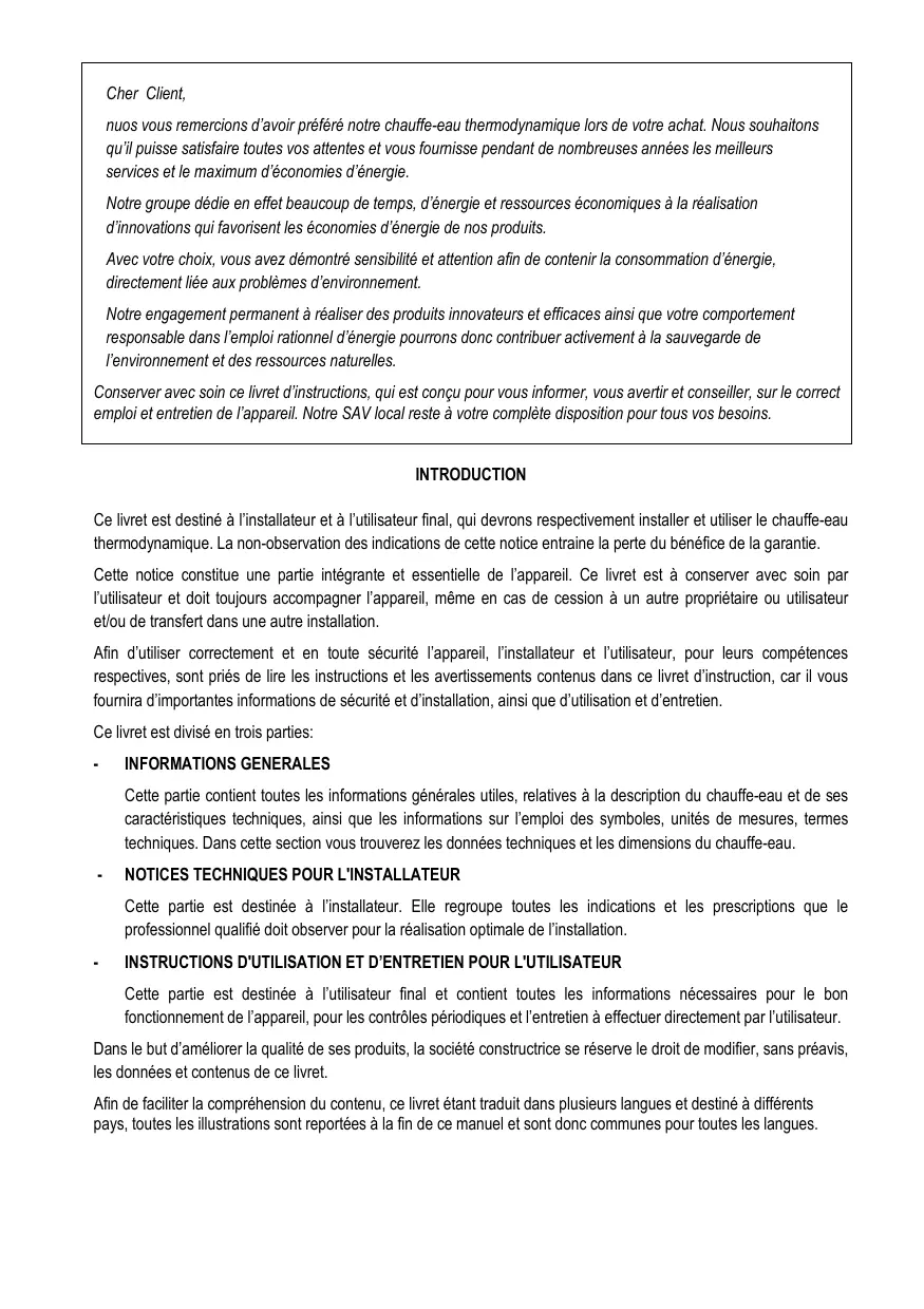 Cher Client, nuos vous remercions d’avoir préféré notre chauffe-eau thermodynamique lors de votre achat. Nous souhaitons qu’il puisse satisfaire toutes vos attentes et vous fournisse pendant de nombreuses années les meilleurs services et le maximum d’économies d’énergie. Notre groupe dédie en effet beaucoup de temps, d’énergie et ressources économiques à la réalisation d’innovations qui favorisent les économies d’énergie de nos produits. Avec votre choix, vous avez démontré sensibilité et attention afin de contenir la consommation d’énergie, directement liée aux problèmes d’environnement. Notre engagement permanent à réaliser des produits innovateurs et efficaces ainsi que votre comportement responsable dans l’emploi rationnel d’énergie pourrons donc contribuer activement à la sauvegarde de l’environnement et des ressources naturelles. Conserver avec soin ce livret d’instructions, qui est conçu pour vous informer, vous avertir et conseiller, sur le correct emploi et entretien de l’appareil. Notre SAV local reste à votre complète disposition pour tous vos besoins. INTRODUCTION Ce livret est destiné à l’installateur et à l’utilisateur final, qui devrons respectivement installer et utiliser le chauffe-eau thermodynamique. La non-observation des indications de cette notice entraine la perte du bénéfice de la garantie. Cette notice constitue une partie intégrante et essentielle de l’appareil. Ce livret est à conserver avec soin par l’utilisateur et doit toujours accompagner l’appareil, même en cas de cession à un autre propriétaire ou utilisateur et/ou de transfert dans une autre installation. Afin d’utiliser correctement et en toute sécurité l’appareil, l’installateur et l’utilisateur, pour leurs compétences respectives, sont priés de lire les instructions et les avertissements contenus dans ce livret d’instruction, car il vous fournira d’importantes informations de sécurité et d’installation, ainsi que d’utilisation et d’entretien. Ce livret est divisé en trois parties: