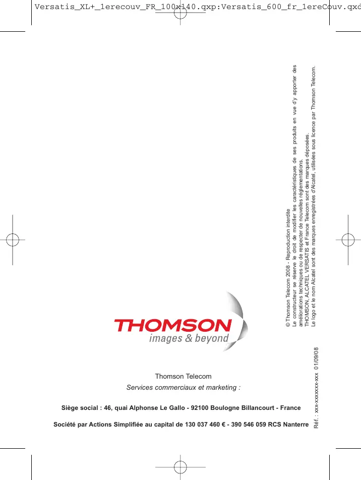 Ne pas utiliser votre poste téléphonique pour signaler une fuite de gaz à proximité de cette fuite. En cas d'orage, il est préconisé de ne pas utiliser cet appareil. Par la présente Thomson Telecom déclare que l’appareil Versatis XL+ est conforme aux exigences essentielles et aux autres dispositions pertinentes de la directive 1999/5/CE. Page versatis_XL+_FR_100x140.qxp:Mise en page 1 16/10/08 13:09