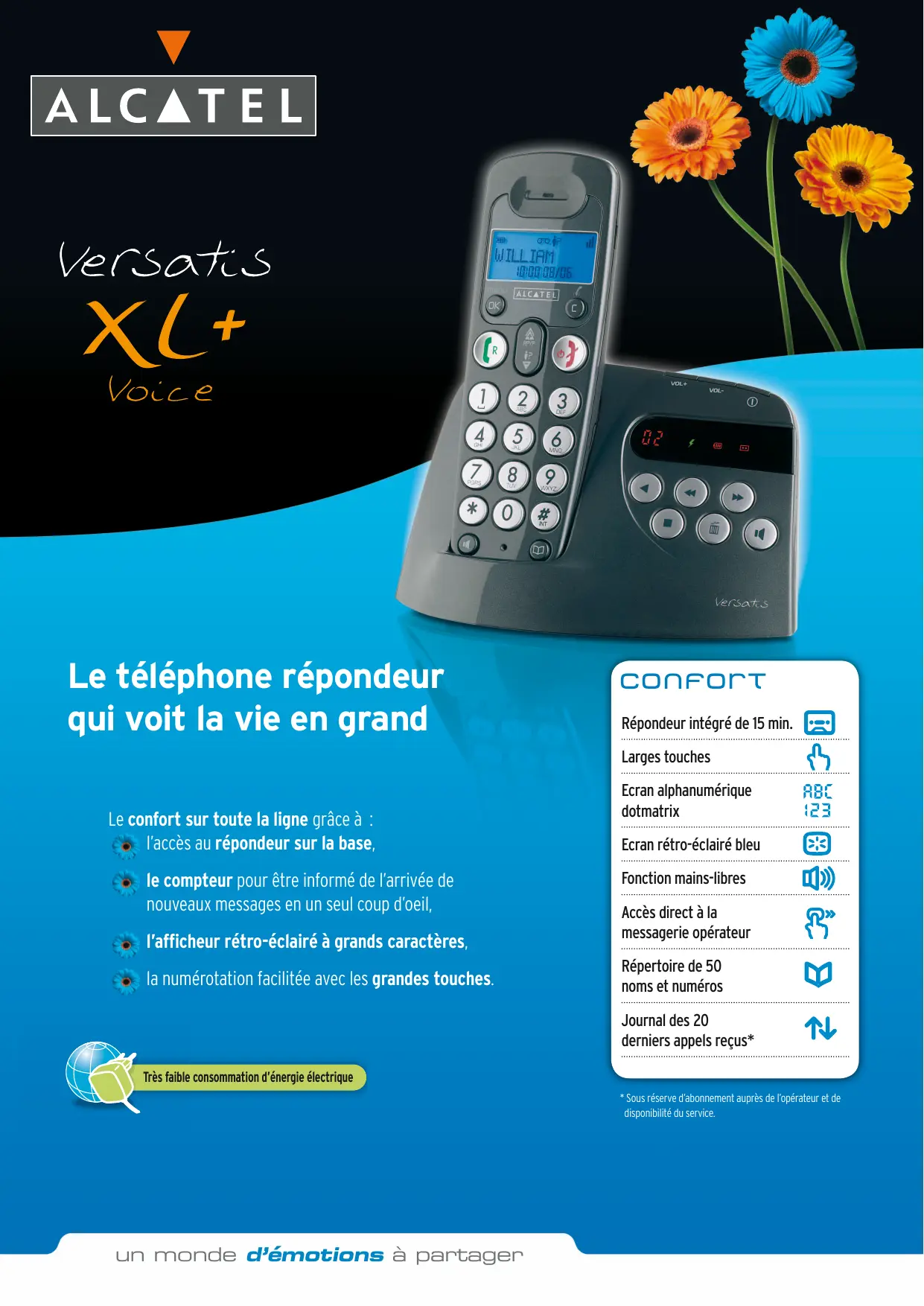 ALCATEL lersars XC+ Voice Le téléphone répondeur qui voit la vie en grand Le confort sur toute la ligne grâce à : l'accès au répondeur sur la base, le compteur pour être informé de l'arrivée de nouveaux messages en un seul coup d'oeil, = l'afficheur rétro-éclairé à grands caractères, = la numérotation facilitée avec les grandes touches. Très faible consommation d'énergie électrique un monde d’émotions à par CONFOrT Répondeur intégré de 15 min. [=] Larges touches d Ecran alphanumérique dotmatrix Ecran rétro-éclairé bleu Fonction mains-libres Accès direct à la messagerie opérateur Répertoire de 50 noms et numéros Journal des 20 derniers appels reçus*