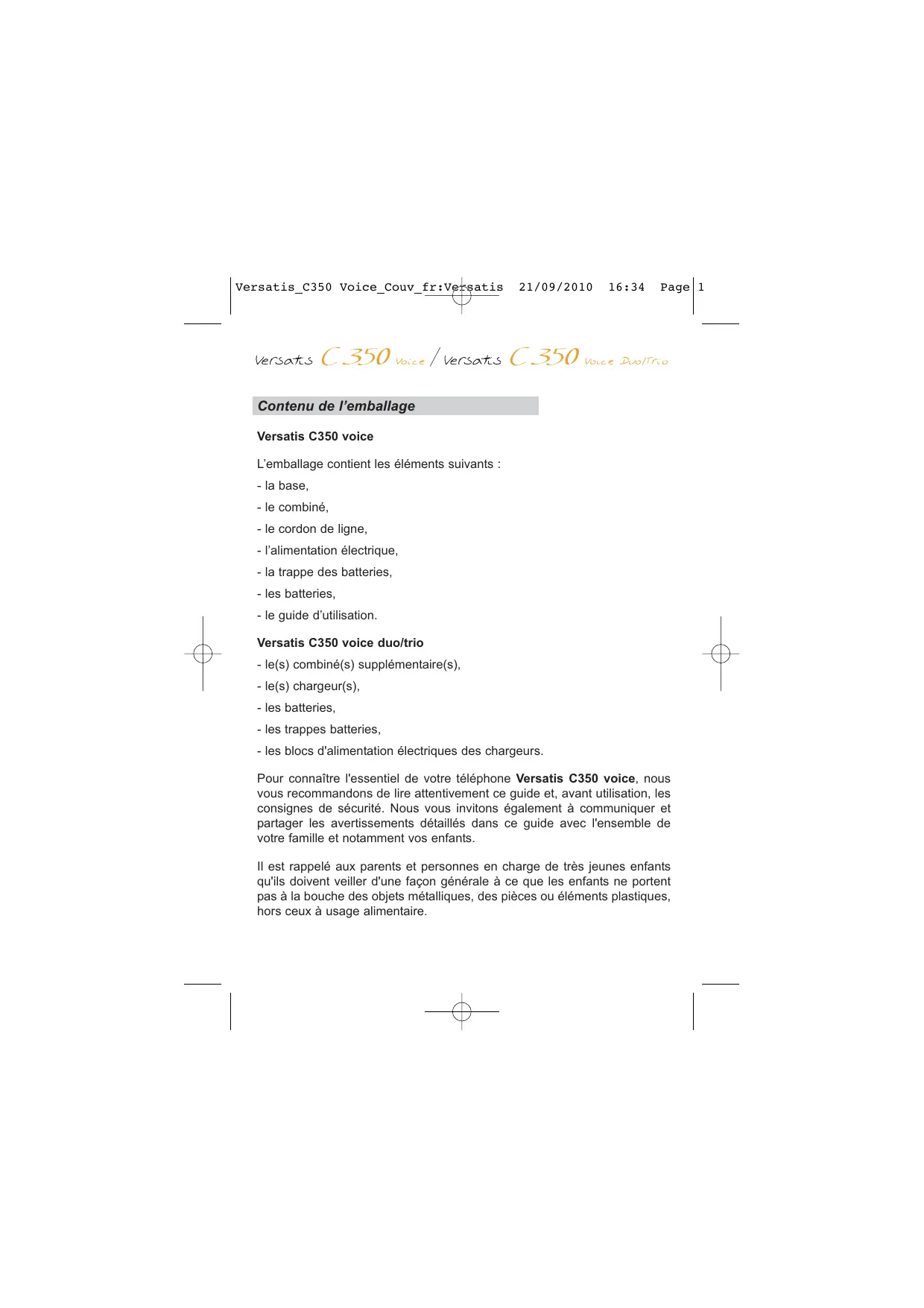 Versatis_C350 Voice_1ère_couv_fr:Mise en page 1 Guide d'utilisation 20/09/2010 09:17 Page 1 Versatis_C350 Voice_Couv_fr:Versatis 21/09/2010 16:34 Page 1 Contenu de l’emballage Versatis C350 voice L’emballage contient les éléments suivants : - la base, - le combiné, - le cordon de ligne, - l’alimentation électrique, - la trappe des batteries, - les batteries, - le guide d’utilisation. Versatis C350 voice duo/trio - le(s) combiné(s) supplémentaire(s), - le(s) chargeur(s), - les batteries, - les trappes batteries, - les blocs d'alimentation électriques des chargeurs. Pour connaître l'essentiel de votre téléphone Versatis C350 voice, nous vous recommandons de lire attentivement ce guide et, avant utilisation, les consignes de sécurité. Nous vous invitons également à communiquer et partager les avertissements détaillés dans ce guide avec l'ensemble de votre famille et notamment vos enfants. Il est rappelé aux parents et personnes en charge de très jeunes enfants qu'ils doivent veiller d'une façon générale à ce que les enfants ne portent pas à la bouche des objets métalliques, des pièces ou éléments plastiques, hors ceux à usage alimentaire. Versatis_C350 Voice_Couv_fr:Versatis 20/09/2010 09:24 Page 2 Les touches du combiné - Décrocher - Flash / Accès à des services opérateurs* - Accès au répondeur - Verrouiller le clavier (appui long) - Raccrocher - Allumer / Eteindre le combiné - Dans les menus : retour à l'écran d'accueil - Accès au répertoire - Accès au menu - Validation - Fonction Secret Lecture ou stop 1 appui : revenir au début du message pendant son écoute 2 appuis : aller au message précédent lors de l'annonce du message me mo Enregistrer un mémo Aller au message suivant Supprimer un message - Augmenter le volume sonore de l’écouteur, du mains libres - Accès aux derniers appels reçus* - Accès aux derniers numéros composés - Insertion d’une pause en numérotation (appui long) - Diminuer le volume sonore de l'écouteur, du mains libres - Retour + Effacer - Appel interne / Conférence Touches de la base et indicateurs lumineux - Activer / Désactiver le mains libres Micro pour dicter une annonce Clignotant : - Communication ou arrivée d'un appel en cours - Association d'un combiné Fixe : - Combiné en charge sur sa base Eteint : - Absence du combiné sur la base Touche Paging Niveau de charge des batteries