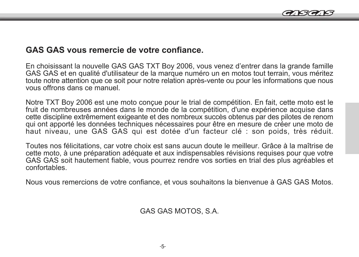 MANUAL DEL USUARIO USER MANUAL MANUEL D’ENTRETIEN LIBRETTO D´USO BETRIEBSANLEITUNG FRANÇAIS MANUEL MANUEL D´ENTRETIEN D´ENTRETIEN GAS GAS vous remercie de votre confiance. En choisissant la nouvelle GAS GAS TXT Boy 2006, vous venez d’entrer dans la grande famille GAS GAS et en qualité d'utilisateur de la marque numéro un en motos tout terrain, vous méritez toute notre attention que ce soit pour notre relation après-vente ou pour les informations que nous vous offrons dans ce manuel. Notre TXT Boy 2006 est une moto conçue pour le trial de compétition. En fait, cette moto est le fruit de nombreuses années dans le monde de la compétition, d'une expérience acquise dans cette discipline extrêmement exigeante et des nombreux succès obtenus par des pilotes de renom qui ont apporté les données techniques nécessaires pour être en mesure de créer une moto de haut niveau, une GAS GAS qui est dotée d'un facteur clé : son poids, très réduit. Toutes nos félicitations, car votre choix est sans aucun doute le meilleur. Grâce à la maîtrise de cette moto, à une préparation adéquate et aux indispensables révisions requises pour que votre GAS GAS soit hautement fiable, vous pourrez rendre vos sorties en trial des plus agréables et confortables. Nous vous remercions de votre confiance, et vous souhaitons la bienvenue à GAS GAS Motos.