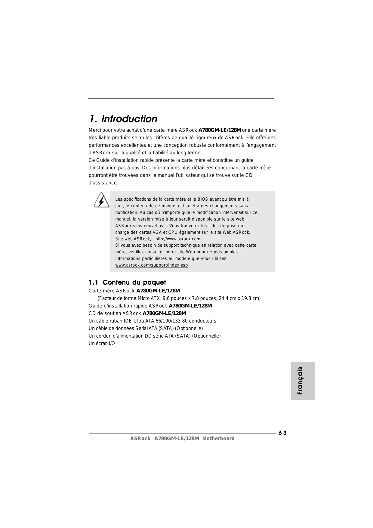Merci pour votre achat d’une carte mère ASRock A780GM-LE/128M une carte mère très fiable produite selon les critères de qualité rigoureux de ASRock. Elle offre des performances excellentes et une conception robuste conformément à l’engagement d’ASRock sur la qualité et la fiabilité au long terme. Ce Guide d’installation rapide présente la carte mère et constitue un guide d’installation pas à pas. Des informations plus détaillées concernant la carte mère pourront être trouvées dans le manuel l’utilisateur qui se trouve sur le CD d’assistance. Les spécifications de la carte mère et le BIOS ayant pu être mis à jour, le contenu de ce manuel est sujet à des changements sans notification. Au cas où n’importe qu’elle modification intervenait sur ce manuel, la version mise à jour serait disponible sur le site web ASRock sans nouvel avis. Vous trouverez les listes de prise en charge des cartes VGA et CPU également sur le site Web ASRock. Site web ASRock, http://www.asrock.com Si vous avez besoin de support technique en relation avec cette carte mère, veuillez consulter notre site Web pour de plus amples informations particulières au modèle que vous utilisez. www.asrock.com/support/index.asp