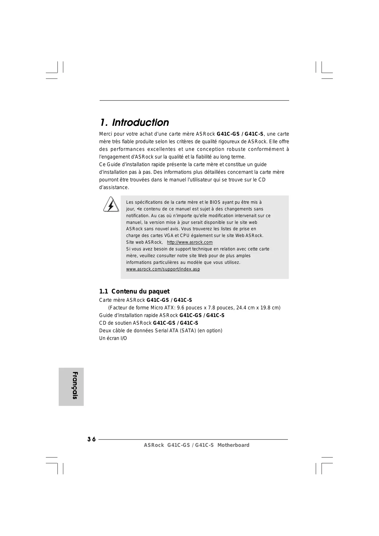Merci pour votre achat d’une carte mère ASRock G41C-GS / G41C-S, une carte mère très fiable produite selon les critères de qualité rigoureux de ASRock. Elle offre des performances excellentes et une conception robuste conformément à l’engagement d’ASRock sur la qualité et la fiabilité au long terme. Ce Guide d’installation rapide présente la carte mère et constitue un guide d’installation pas à pas. Des informations plus détaillées concernant la carte mère pourront être trouvées dans le manuel l’utilisateur qui se trouve sur le CD d’assistance. Les spécifications de la carte mère et le BIOS ayant pu être mis à jour, •le contenu de ce manuel est sujet à des changements sans notification. Au cas où n’importe qu’elle modification intervenait sur ce manuel, la version mise à jour serait disponible sur le site web ASRock sans nouvel avis. Vous trouverez les listes de prise en charge des cartes VGA et CPU également sur le site Web ASRock. Site web ASRock, http://www.asrock.com Si vous avez besoin de support technique en relation avec cette carte mère, veuillez consulter notre site Web pour de plus amples informations particulières au modèle que vous utilisez. www.asrock.com/support/index.asp