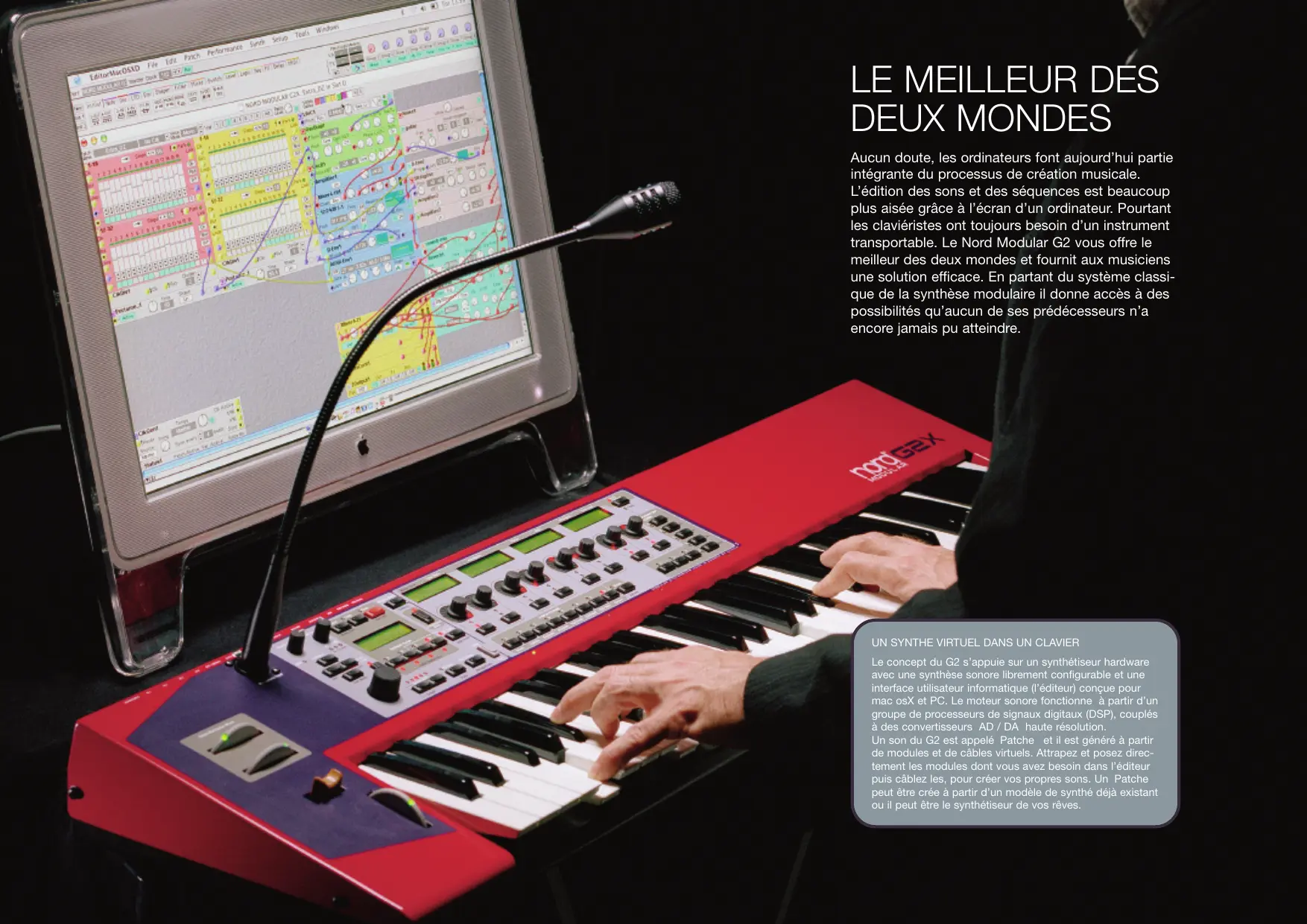 DEUX MONDES Aucun doute, les ordinateurs font aujourd’hui partie intégrante du processus de création musicale. L’édition des sons et des séquences est beaucoup plus aisée grâce à l’écran d’un ordinateur. Pourtant les claviéristes ont toujours besoin d’un instrument transportable. Le Nord Modular G2 vous offre le meilleur des deux mondes et fournit aux musiciens une solution efficace. En partant du système classique de la synthèse modulaire il donne accès à des possibilités qu’aucun de ses prédécesseurs n’a encore jamais pu atteindre.