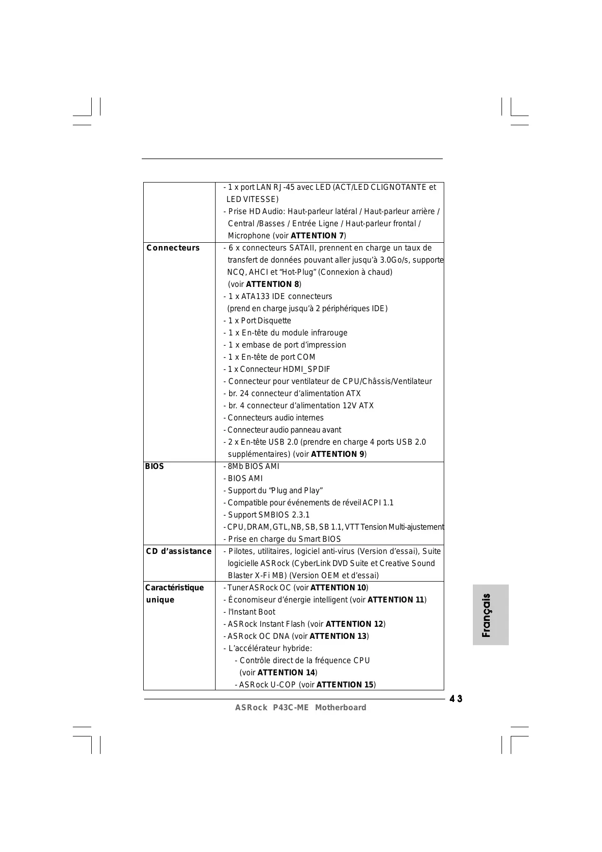 LED VITESSE) - Prise HD Audio: Haut-parleur latéral / Haut-parleur arrière / Central /Basses / Entrée Ligne / Haut-parleur frontal / Microphone (voir ATTENTION 7) - 6 x connecteurs SATAII, prennent en charge un taux de transfert de données pouvant aller jusqu’à 3.0Go/s, supporte NCQ, AHCI et “Hot-Plug” (Connexion à chaud) (voir ATTENTION 8) - 1 x ATA133 IDE connecteurs (prend en charge jusqu’à 2 périphériques IDE) - 1 x Port Disquette - 1 x En-tête du module infrarouge - 1 x embase de port d’impression - 1 x En-tête de port COM - 1 x Connecteur HDMI_SPDIF - Connecteur pour ventilateur de CPU/Châssis/Ventilateur - br. 24 connecteur d’alimentation ATX - br. 4 connecteur d’alimentation 12V ATX - Connecteurs audio internes - Connecteur audio panneau avant - 2 x En-tête USB 2.0 (prendre en charge 4 ports USB 2.0 supplémentaires) (voir ATTENTION 9) - 8Mb BIOS AMI - BIOS AMI - Support du “Plug and Play” - Compatible pour événements de réveil ACPI 1.1 - Support SMBIOS 2.3.1 - CPU, DRAM, GTL, NB, SB, SB 1.1, VTT Tension Multi-ajustement - Prise en charge du Smart BIOS - Pilotes, utilitaires, logiciel anti-virus (Version d’essai), Suite logicielle ASRock (CyberLink DVD Suite et Creative Sound Blaster X-Fi MB) (Version OEM et d’essai) - Tuner ASRock OC (voir ATTENTION 10) - Économiseur d’énergie intelligent (voir ATTENTION 11) - l'Instant Boot - ASRock Instant Flash (voir ATTENTION 12) - ASRock OC DNA (voir ATTENTION 13) - L’accélérateur hybride: - Contrôle direct de la fréquence CPU (voir ATTENTION 14) - ASRock U-COP (voir ATTENTION 15)