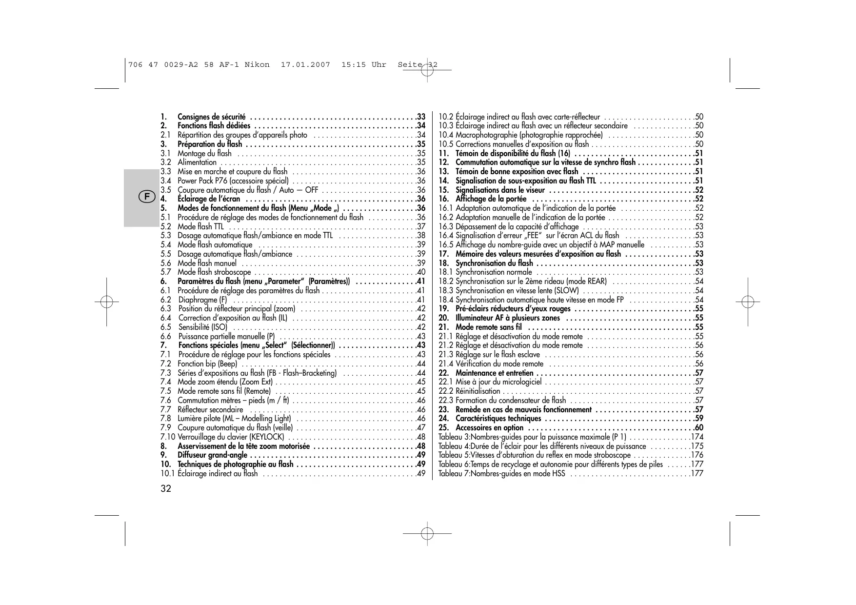 10.2 Éclairage indirect au flash avec carte-réflecteur 50 10.3 Éclairage indirect au flash avec un réflecteur secondaire 50 10.4 Macrophotographie (photographie rapprochée) 50 10.5 Corrections manuelles d'exposition au flash 50 11. Témoin de disponibilité du flash (16) 51 12. Commutation automatique sur la vitesse de synchro flash 51 13. Témoin de bonne exposition avec flash 51 14. Signalisation de sous-exposition au flash TTL 51 15. Signalisations dans le viseur 52 16. Affichage de la portée 52 16.1 Adaptation automatique de l'indication de la portée 52 16.2 Adaptation manuelle de l'indication de la portée 52 16.3 Dépassement de la capacité d'affichage 53 16.4 Signalisation d'erreur "FEE" sur l'écran ACL du flash 53 16.5 Affichage du nombre-guide avec un objectif à MAP manuelle 53 17. Mémoire des valeurs mesurées d'exposition au flash 53 18. Synchronisation du flash 53 18.1 Synchronisation normale 53 18.2 Synchronisation sur le 2ème rideau (mode REAR) 54 18.3 Synchronisation en vitesse lente (SLOW) 54 18.4 Synchronisation automatique haute vitesse en mode FP 54 19. Pré-éclairs réducteurs d'yeux rouges 55 20. Illuminateur AF à plusieurs zones 55 21. Mode remote sans fil 55 21.1 Réglage et désactivation du mode remote 55 21.2 Réglage et désactivation du mode remote 56 21.3 Réglage sur le flash esclave 56 21.4 Vérification du mode remote 56 22. Maintenance et entretien 57 22.1 Mise à jour du micrologiciel 57 22.2 Réinitialisation 57 22.3 Formation du condensateur de flash 57 23. Remède en cas de mauvais fonctionnement 57 24. Caractéristiques techniques 59 25. Accessoires en option 60 Tableau 3: Nombres-guides pour la puissance maximale (P 1) 174 Tableau 4: Durée de l'éclair pour les différents niveaux de puissance 175 Tableau 5: Vitesses d'obturation du reflex en mode stroboscope 176 Tableau 6: Temps de recyclage et autonomie pour différents types de piles 177 Tableau 7: Nombres-guides en mode HSS 177