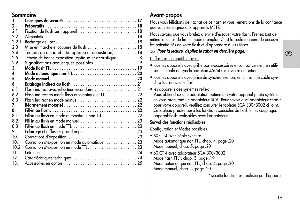 - 60 CT-4 avec adaptateur SCA 300/3002 Mode flash TTL*, chap. 3, page .19 Mode automatique non TTL, chap. 4, page .20 Mode manuel, chap. 5, page .20