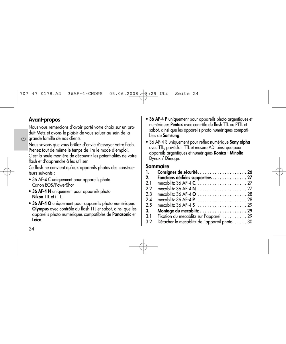 - 29 Uhr Seite 24 + 36 AF-4 P uniquement pour appareils photo argentiques et numériques Pentax avec contrôle du flash TTL ou PTIL et sabot, ainsi que les appareils photo numériques compati- bles de Samsung + 36 AF-4 S uniquement pour reflex numérique Sony alpha avec TTL, pré-éclair TIL et mesure ADI ainsi que pour appareils argentiques et numériques Konica - Minolta Dynax / Dimage. Sommaire . Consignes de sécurité