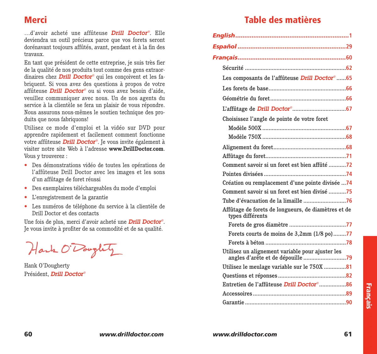 Utilisez ce mode d'emploi et la video sur DVD pour apprendre rapidement et facilement comment fonctionne votre affüteuse Drill Doctor. Je vous invite également à visiter notre site Web à l'adresse www.DrillDoctor.com. Vous y trouvez :