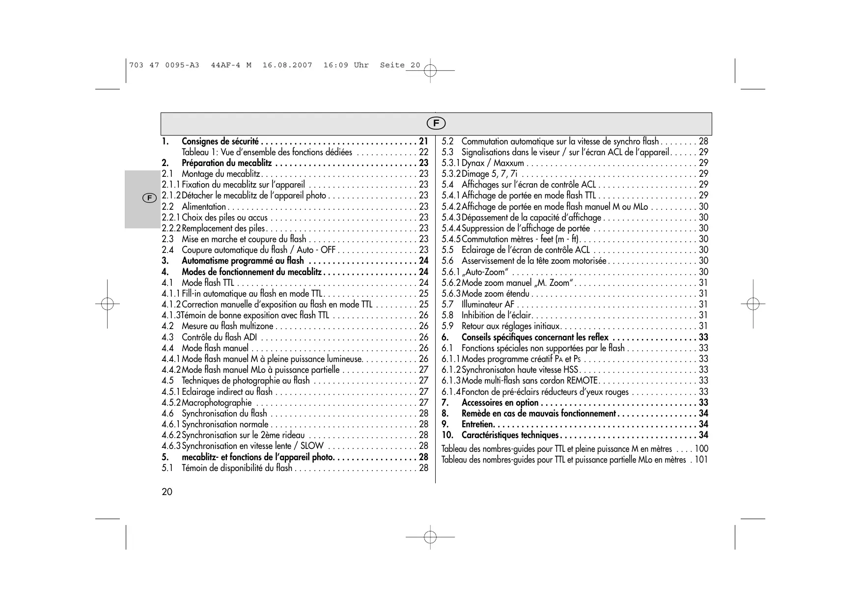 703 47 0095-A3 44AF-4 M 16.08.2007 16:09 Uhr blitz affiche la distance flash-sujet à respecter pour obtenir une photo cor- rectement exposée au flash [voir aussi 5.4.2]. Procédure de réglage pour le mode flash manuel M + Mettre en marche le mecablitz avec l'interrupteur général. « Répéter l'appui sur la touche Mode” jusqu'à ce que ,M” clignote sur l'écran ACL. Le réglage prend effet immédiatement. Après env. 5 s, l'écran ACL re- tourne à l'affichage normal.