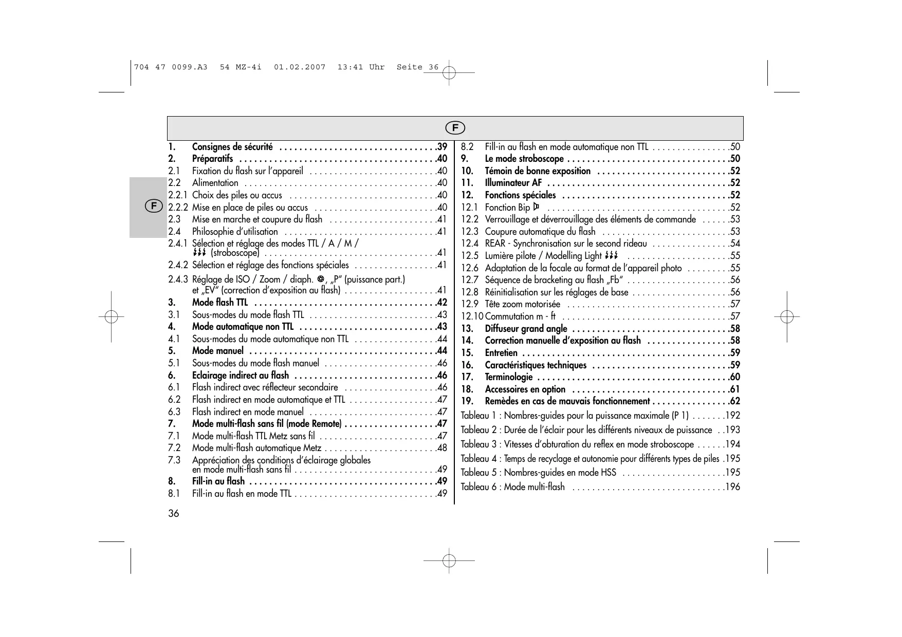 Consignes de sécurité Préparatifs « Fixation du flash ar l'apparal darrreeeeeeeneceeeeeeee AOÛ Alimentation .......................................40 Choix des piles ou accus ........... . 40 Mise en place de piles ou accus ........................ 40 Mise en marche et coupure du Rash | .................... dl Philosophie d'utilisation ...... RE | Sélection et réglage des modes TTL JAÎM à 345 (sroboscopdl Luce. A Sélection et réglage des fonctions spéciales EE | Réglage de ISO / Zoom / diaph. ©, ,P fuisonce pan] et ,EV” (correction d'exposition au flash} ..... 41 Mode flash TTL . 42 Sous-modes du mode flash TTL : 43 Mode automatique non TIL ....... 43 Sous-modes du mode automatique non TTL 44 Mode manuel ................. dec. M4 Sous-modes du mode flash manuel 46 Eclairage indirect au flash . 46 Flash indirect avec réflecteur secondaire 46 Flash indirect en mode automatique et TTL . . A7 Flash indirect en mode manuel Mode multi-flash sans fil (mode Remote]. . Mode multi-flash TTL Metz sans fil . Mode multi-flash automatique Metz . . Appréciarion des conditions d' écirage globales en mode multi-flash sans fil … er 2 Fillin au flash .......... Fill-in au flash en mode TTL .… ans