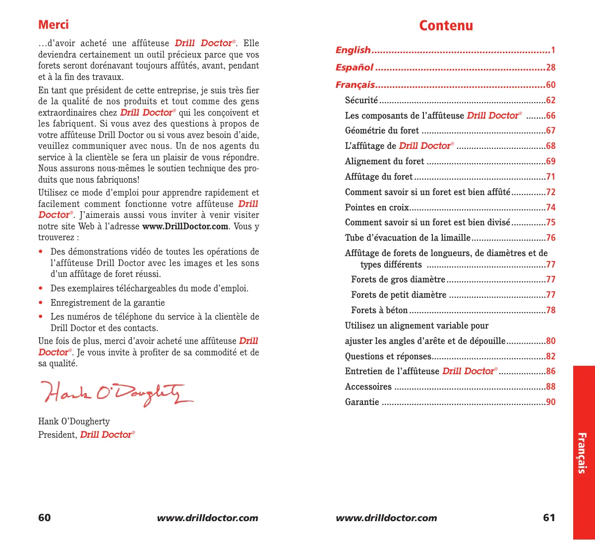 Utilisez ce mode d'emploi pour apprendre rapidement et facilement comment fonctionne votre affühteuse Drill Doctor. J'aimeais aussi vous inviter à venir visiter notre site Web à l'adresse www.DrillDoctor.com. Vous y trouverez :