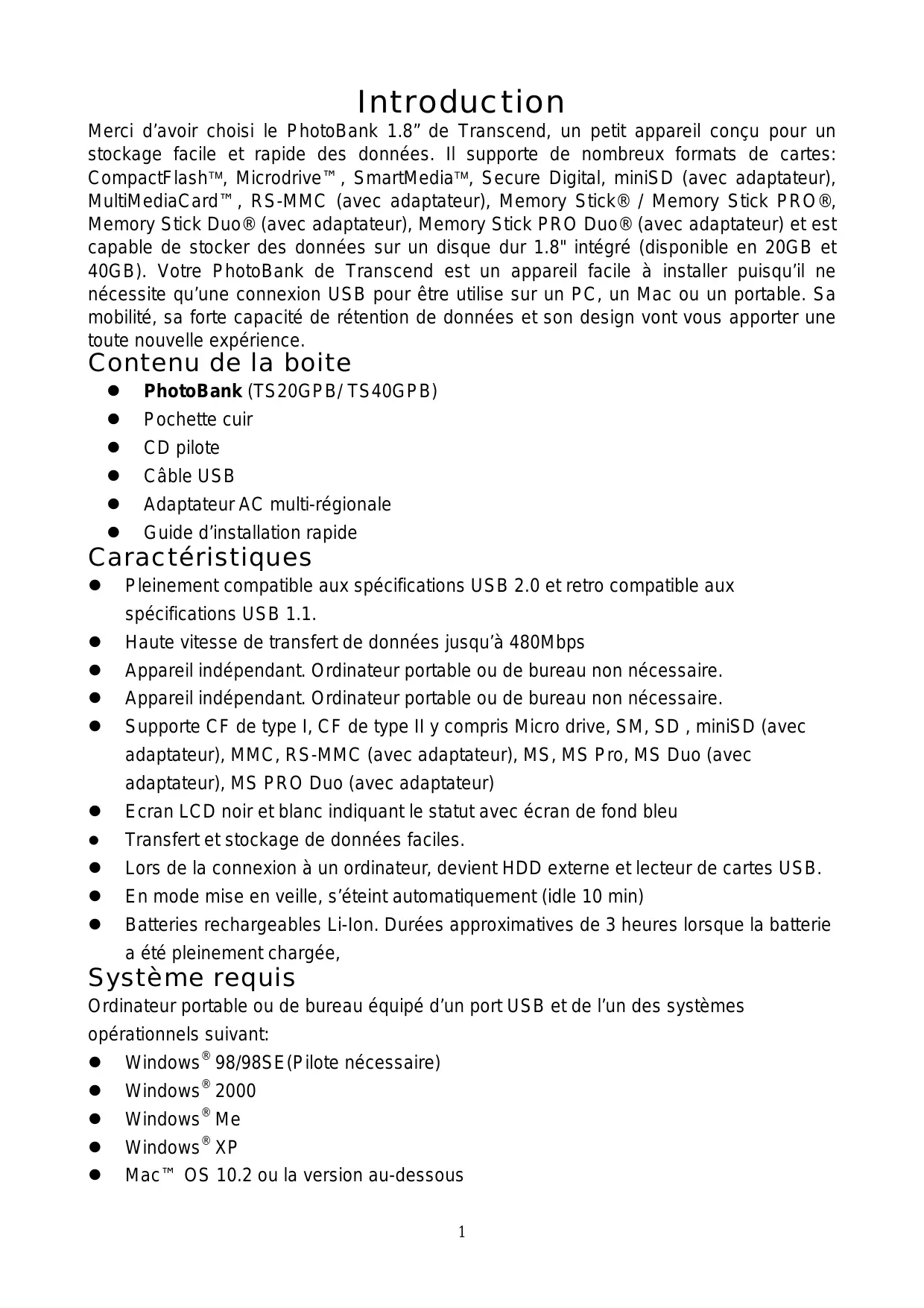 Merci d'avoir choisi le PhotoBank 1.8" de Transcend, un petit appareil conçu pour un stockage facile et rapide des données. Il supporte de nombreux formats de cartes : CompactFlash™, Microdrive™, SmartMedia™, Secure Digital, miniSD (avec adaptateur), MultiMediaCard™, RS-MMC (avec adaptateur), Memory Stick® / Memory Stick PRO®, Memory Stick Duo® (avec adaptateur), Memory Stick PRO Duo® (avec adaptateur) et est capable de stocker des données sur un disque dur 1.8" intégré (disponible en 20 Go et 40 Go). Le PhotoBank de Transcend est un appareil facile à installer puisqu'il ne nécessite qu'une connexion USB pour être utilisé sur un PC, un Mac ou un portable. Sa mobilité, sa forte capacité de stockage de données et son design vont vous apporter une toute nouvelle expérience.