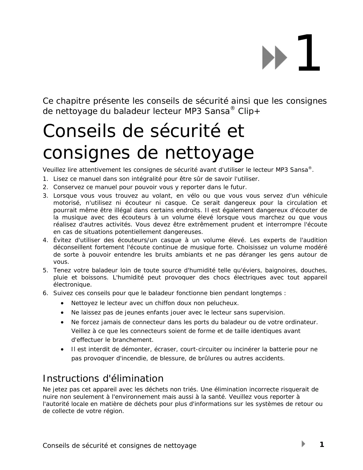 Ce chapitre présente les conseils de sécurité ainsi que les consignes de nettoyage du baladeur lecteur MP3 Sansa® Clip+ Conseils de sécurité et consignes de nettoyage Veuillez lire attentivement les consignes de sécurité avant d'utiliser le lecteur MP3 Sansa®.