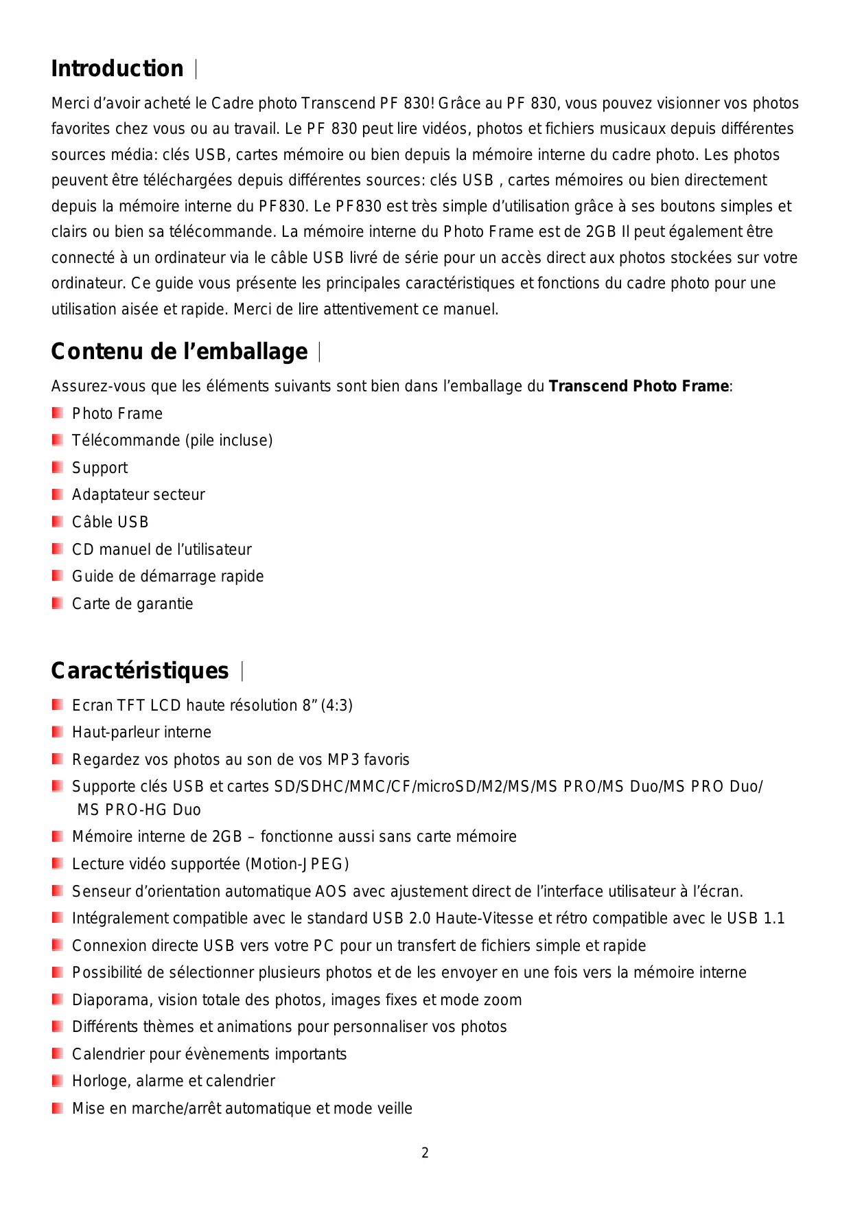 Merci d'avoir acheté le Cadre photo Transcend PF 830! Grâce au PF 830, vous pouvez visionner vos photos favorites chez vous ou au travail. Le PF 830 peut dire videos, photos et fichiers musicaux depuis différentes sources média: clés USB, cartes mémoire ou bien depuis la mémoire interne du cadre photo. Les photos peuvent être téléchargées depuis différentes sources: clés USB, cartes mémoires ou bien directement depuis la mémoire interne du PF830. Le PF830 est très simple d'utilisation grâce à ses boutons simples et clairs ou bien sa télécommande. La mémoire interne du Photo Frame est de 2GB Il peut également être connecté à un ordinateur via le cable USB livre de série pour un accès direct aux photos stockées sur votre ordinateur. Ce guide vous présente les principales caractéristiques et fonctions du cadre photo pour une utilisation aisée et rapide. Merci de dire attentivement ce manuel.
