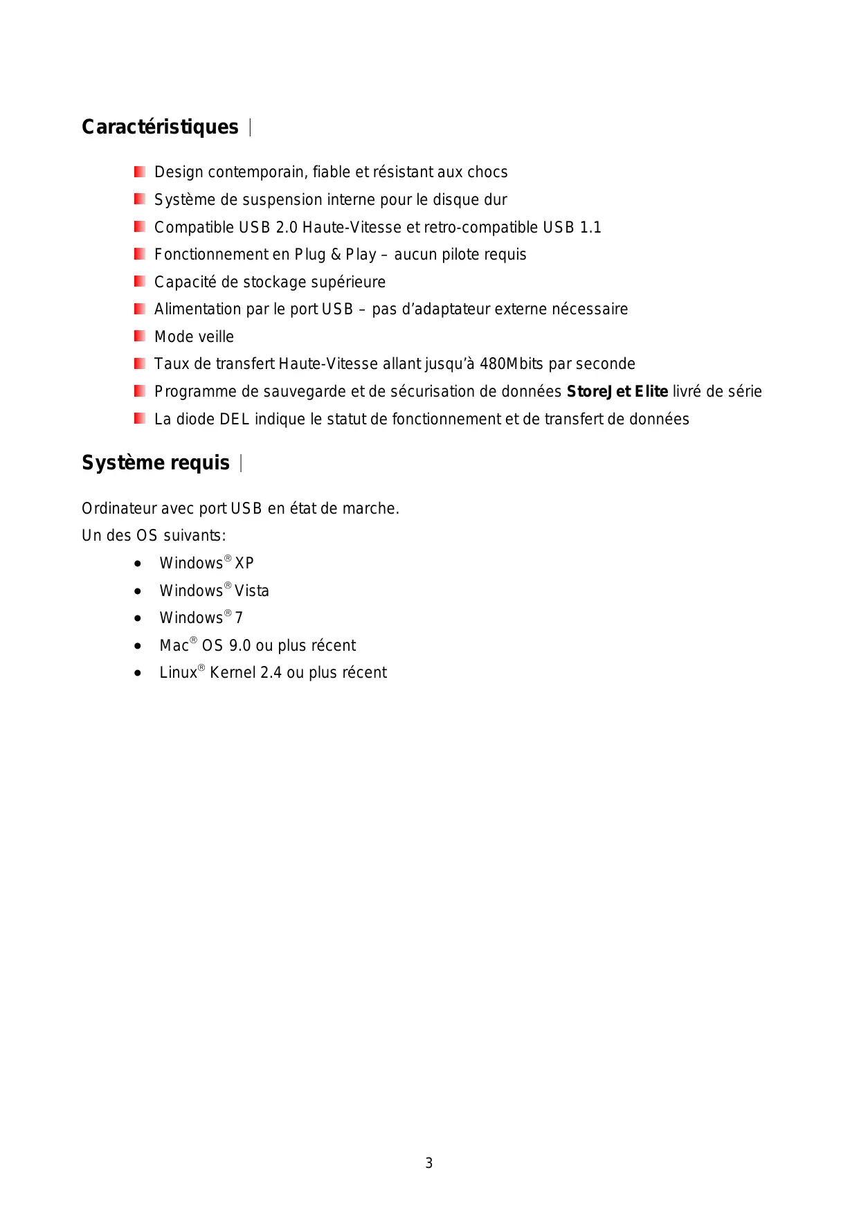 Le StoreJet 25 est pré-formaté en système de fichier FAT32 qui est compatible avec quasiment tous les ordinateurs et quasiment toutes les versions de Windows®, Mac® et Linux®. Si vous pensez utiliser cette StoreJet avec différents ordinateurs, consoles deiaux video ou apparéil électronique compatible, nous vous conseillons de garder le système de fichier en FAT32. Si le fichier fait plus de 4GB, veuillez convertir le StoreJet en système de fichier NTFS. Reportez-vous à la section "Formater le disque dur" de ce manuel pour plus de détails.