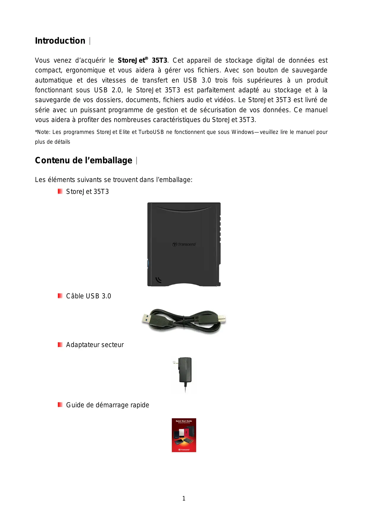 - Limitation de garantie Transcend︱ ︱ Introduction︱ Vous venez d’acquérir le StoreJet 35T3. Cet appareil de stockage digital de données est compact, ergonomique et vous aidera à gérer vos fichiers. Avec son bouton de sauvegarde automatique et des vitesses de transfert en USB 3.0 trois fois supérieures à un produit fonctionnant sous USB 2.0, le StoreJet 35T3 est parfaitement adapté au stockage et à la sauvegarde de vos dossiers, documents, fichiers audio et vidéos. Le StoreJet 35T3 est livré de série avec un puissant programme de gestion et de sécurisation de vos données. Ce manuel vous aidera à profiter des nombreuses caractéristiques du StoreJet 35T3. *Note: Les programmes StoreJet Elite et TurboUSB ne fonctionnent que sous Windows—veuillez lire le manuel pour plus de détails Contenu de l’emballage︱ Les éléments suivants se trouvent dans l’emballage: StoreJet 35T3 Câble USB 3.0 Adaptateur secteur Guide de démarrage rapide p. 24