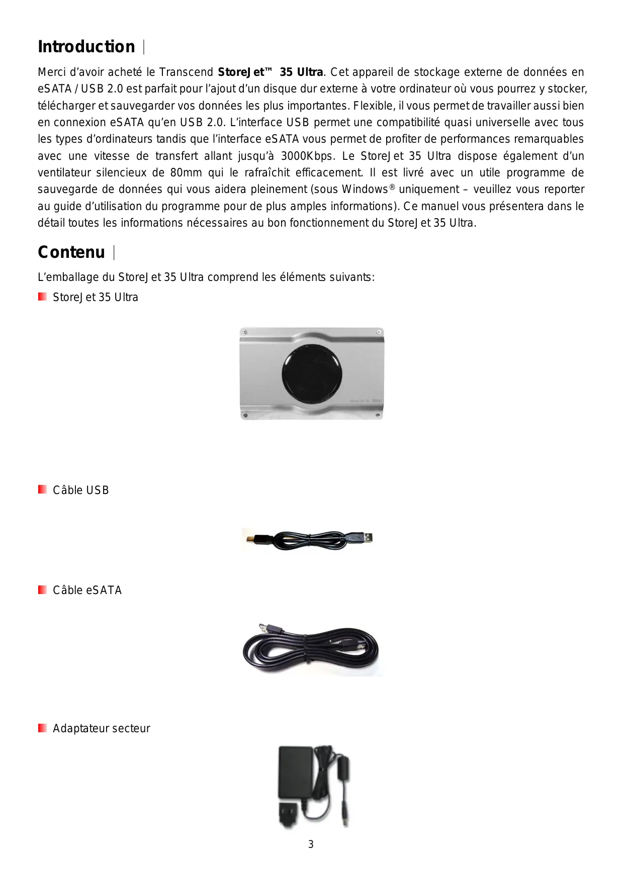 Introduction︱ Merci d’avoir acheté le Transcend StoreJet™ 35 Ultra. Cet appareil de stockage externe de données en eSATA / USB 2.0 est parfait pour l’ajout d’un disque dur externe à votre ordinateur où vous pourrez y stocker, télécharger et sauvegarder vos données les plus importantes. Flexible, il vous permet de travailler aussi bien en connexion eSATA qu’en USB 2.0. L’interface USB permet une compatibilité quasi universelle avec tous les types d’ordinateurs tandis que l’interface eSATA vous permet de profiter de performances remarquables avec une vitesse de transfert allant jusqu’à 3000Kbps. Le StoreJet 35 Ultra dispose également d’un ventilateur silencieux de 80mm qui le rafraîchit efficacement. Il est livré avec un utile programme de sauvegarde de données qui vous aidera pleinement (sous Windows® uniquement – veuillez vous reporter au guide d’utilisation du programme pour de plus amples informations). Ce manuel vous présentera dans le détail toutes les informations nécessaires au bon fonctionnement du StoreJet 35 Ultra. Contenu︱ L’emballage du StoreJet 35 Ultra comprend les éléments suivants: StoreJet 35 Ultra Câble USB Câble eSATA Adaptateur secteur