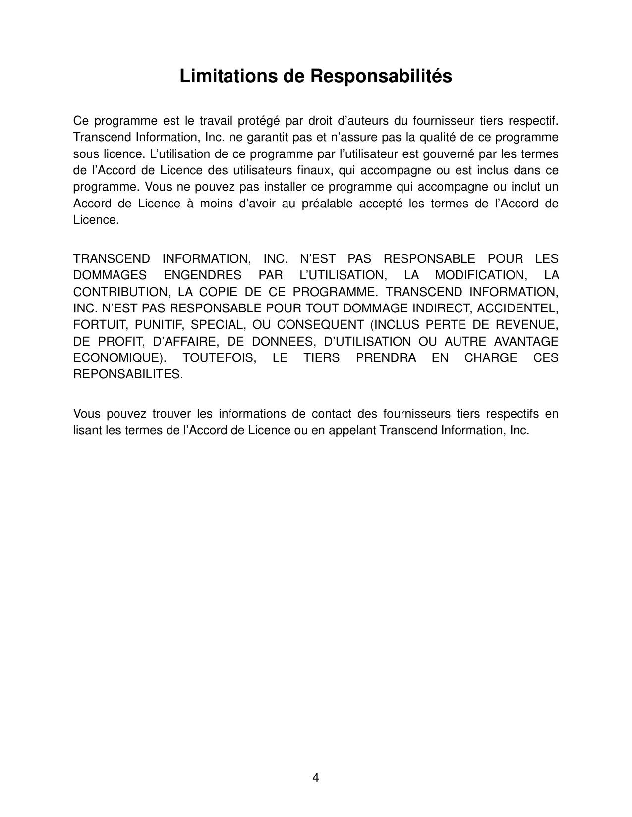 Limitations de Responsabilités Ce programme est le travail protégé par droit d’auteurs du fournisseur tiers respectif. Transcend Information, Inc. ne garantit pas et n’assure pas la qualité de ce programme sous licence. L’utilisation de ce programme par l’utilisateur est gouverné par les termes de l’Accord de Licence des utilisateurs finaux, qui accompagne ou est inclus dans ce programme. Vous ne pouvez pas installer ce programme qui accompagne ou inclut un Accord de Licence à moins d’avoir au préalable accepté les termes de l’Accord de Licence. TRANSCEND INFORMATION, INC. N’EST PAS RESPONSABLE POUR LES DOMMAGES ENGENDRES PAR L’UTILISATION, LA MODIFICATION, LA CONTRIBUTION, LA COPIE DE CE PROGRAMME. TRANSCEND INFORMATION, INC. N’EST PAS RESPONSABLE POUR TOUT DOMMAGE INDIRECT, ACCIDENTEL, FORTUIT, PUNITIF, SPECIAL, OU CONSEQUENT (INCLUS PERTE DE REVENUE, DE PROFIT, D’AFFAIRE, DE DONNEES, D’UTILISATION OU AUTRE AVANTAGE ECONOMIQUE). TOUTEFOIS, LE TIERS PRENDRA EN CHARGE CES REPONSABILITES. Vous pouvez trouver les informations de contact des fournisseurs tiers respectifs en lisant les termes de l’Accord de Licence ou en appelant Transcend Information, Inc.