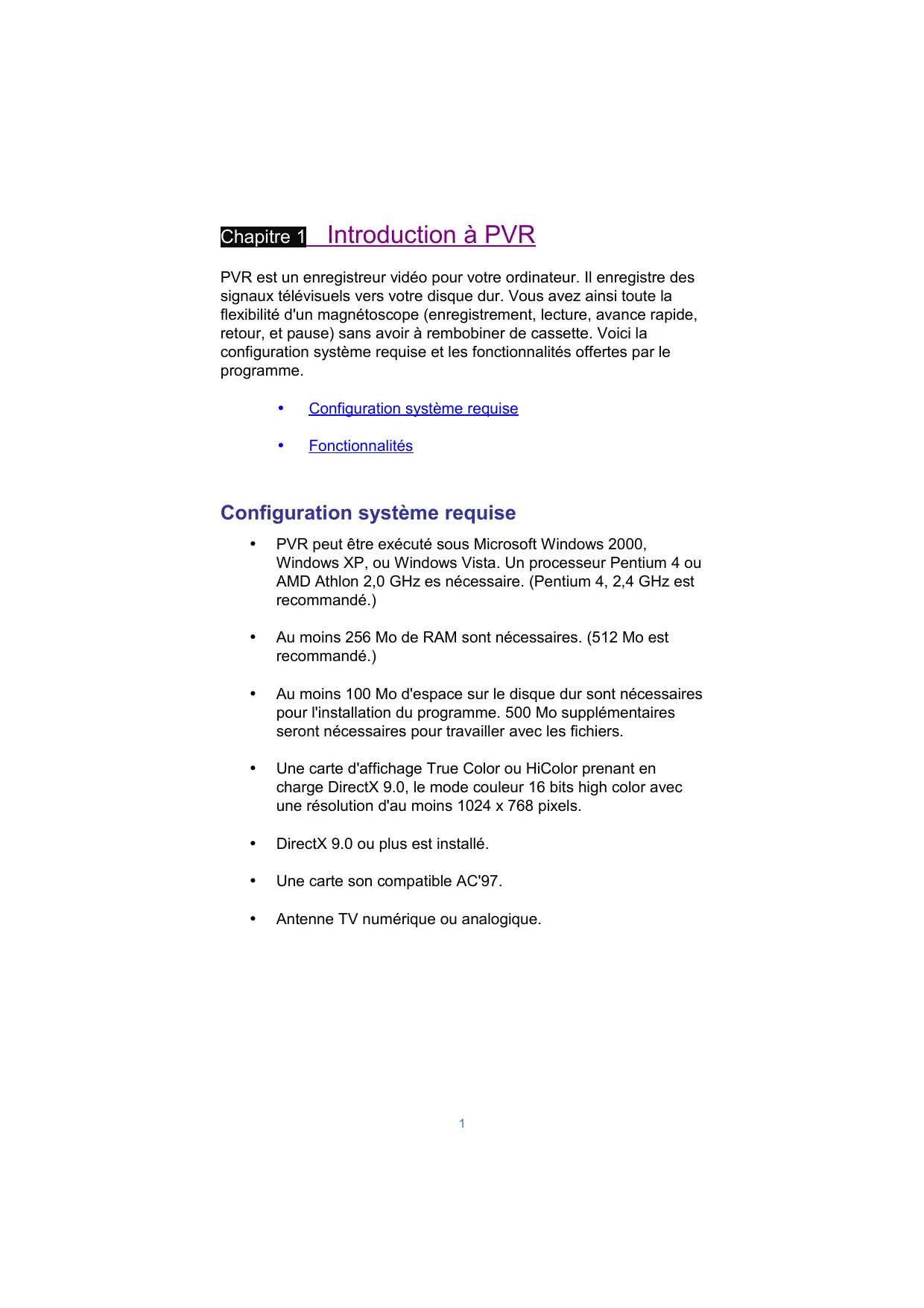 PVR est un enregistreur vidéo pour votre ordinateur. Il enregistre des signaux télévisuels vers votre disque dur. Vous avez ainsi toute la flexibilité d'un magnétoscope (enregistrement, lecture, avance rapide, retard, et pause) sans avoir à rembobiner de cassette. Voici la configuration système requise et les fonctionnalités offertes par le programme.