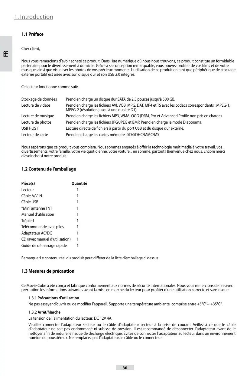 Nous you remercions d'avoir acheté ce produit. Dans l'ere numérique ou nous nos trouvons, ce produit constitue un formidable partenaire pour le divertissement a domicile. Grace a conception remarquable, vous pouvez profiter de vos films et de toute musique, ainsi que visualiser les photos de vos précieux moments. L'utilisation de ce produit en tant que périhérique de stockage exter portatif est aiee avec son disque dur et son USB 2.0 integres.