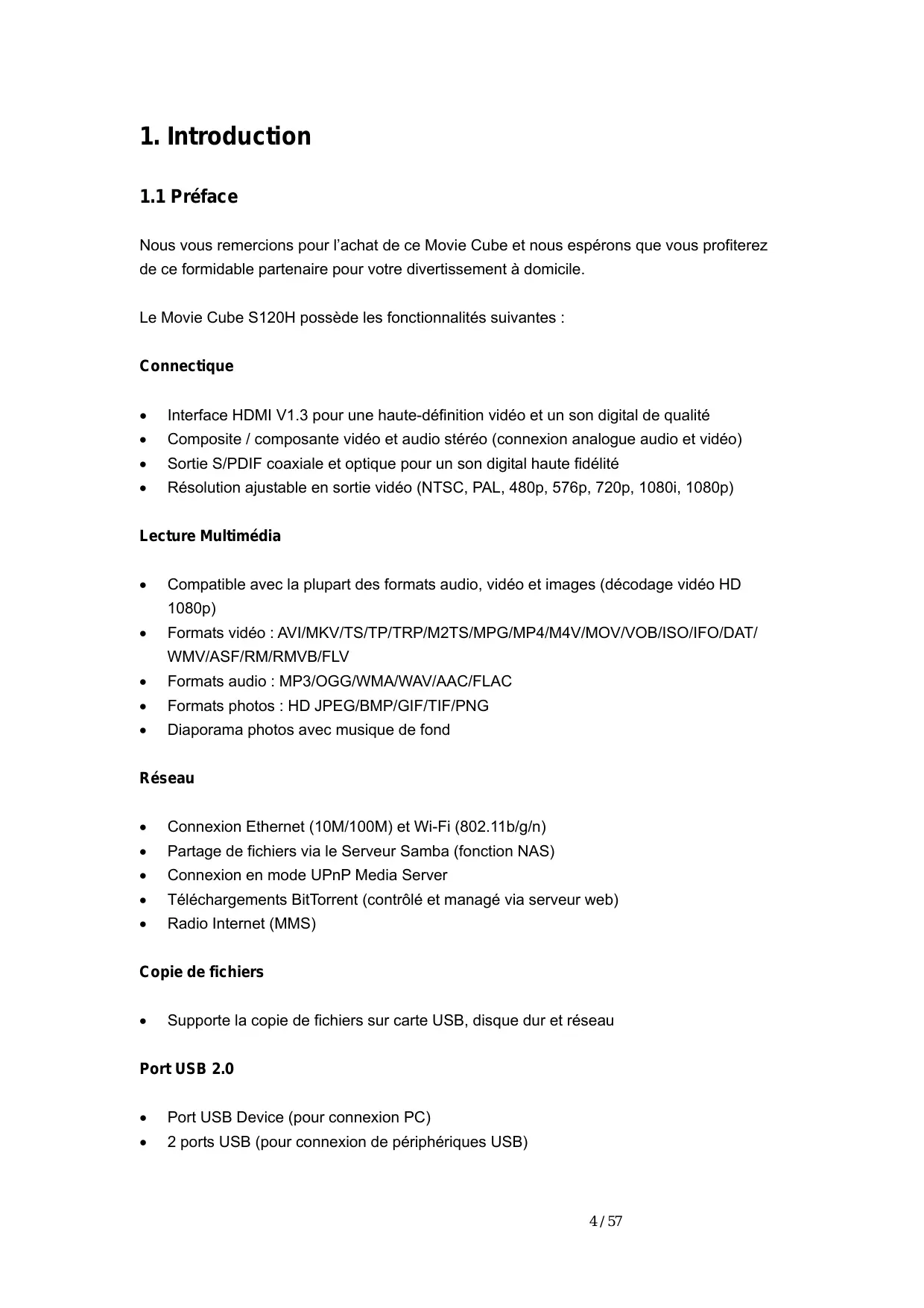 - AVI/MKV/TS/TP/TRP/M2TS/MPG/MP4/MOV/M4V/VOB/ISO/IFO/DAT/WMV/ASF/RM/RMVB/FLV, résolution jusqu'à 720p/1080i/1080p