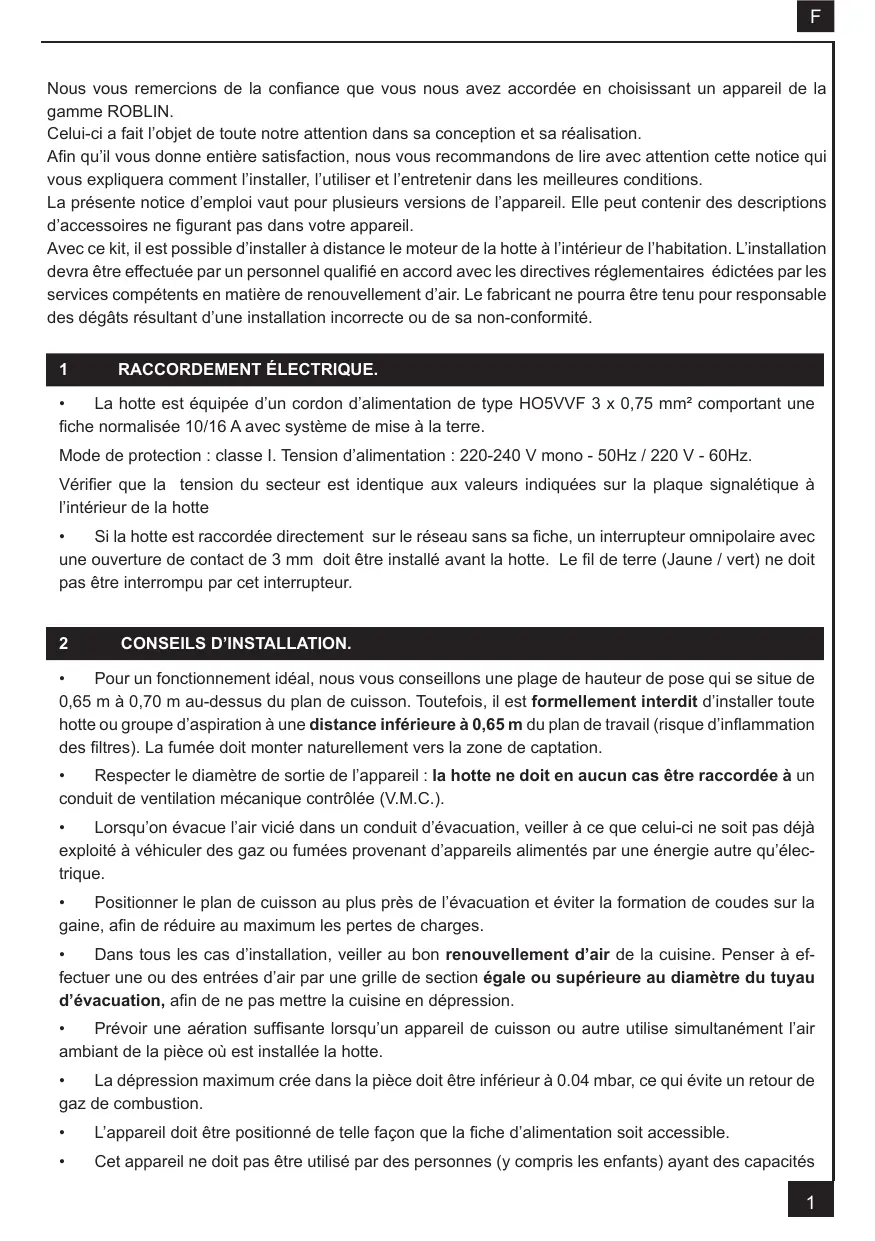 FUNZIONAMENTO NUTZUNG Nous vous remercions de la confiance que vous nous avez accordée en choisissant un appareil de la gamme ROBLIN. Celui-ci a fait l’objet de toute notre attention dans sa conception et sa réalisation. Afin qu’il vous donne entière satisfaction, nous vous recommandons de lire avec attention cette notice qui vous expliquera comment l’installer, l’utiliser et l’entretenir dans les meilleures conditions. La présente notice d’emploi vaut pour plusieurs versions de l’appareil. Elle peut contenir des descriptions d’accessoires ne figurant pas dans votre appareil. Avec ce kit, il est possible d’installer à distance le moteur de la hotte à l’intérieur de l’habitation. L’installation devra être effectuée par un personnel qualifié en accord avec les directives réglementaires édictées par les services compétents en matière de renouvellement d’air. Le fabricant ne pourra être tenu pour responsable des dégâts résultant d’une installation incorrecte ou de sa non-conformité.