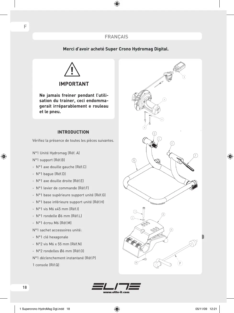 FRANÇAIS Merci d’avoir acheté Super Crono Hydromag Digital. IMPORTANT Ne jamais freiner pendant l’utilisation du trainer, ceci endommagerait irréparablement e rouleau et le pneu. INTRODUCTION Vérifiez la présence de toutes les pièces suivantes. N°1 Unité Hydromag (Réf. A) N°1 support (Réf.B) - N°1 axe douille gauche (Réf.C) - N°1 bague (Réf.D) - N°1 axe douille droite (Réf.E) - N°1 levier de commande (Réf.F) - N°1 base supérieure support unité (Réf.G) - N°1 base inférieure support unité (Réf.H) - N°1 vis M6 x45 mm (Réf.I) - N°1 rondelle Ø6 mm (Réf.L) - N°1 écrou M6 (Réf.M) N°1 sachet accessoires unité: - N°1 clé hexagonale