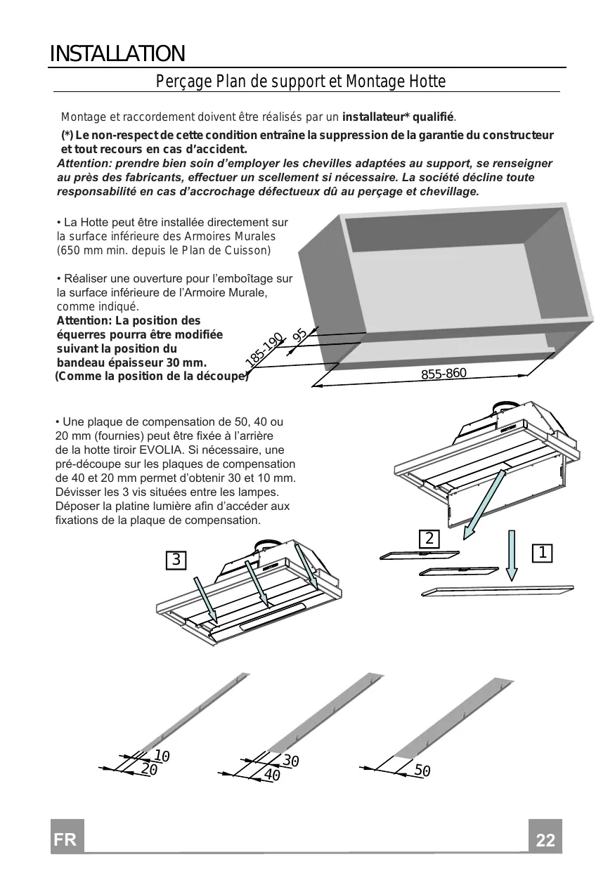 INSTALLATION Perçage Plan de support et Montage Hotte Montage et raccordement doivent être réalisés par un installateur* qualifié. {*) Le non-respect de cette condition entraîne la suppression de la garantie du constructeur ettout recours en cas d'accident. Attention: prendre bien soin d'employer les chevilles adaptées au support, se renseigner au près des fabricants, effectuer un scellement si nécessaire. La société décline toute responsabilité en cas d'accrochage défectueux dû au perçage et chevillage. + La Hotte peut être installée directement sur la surface inférieure des Armoires Murales (650 mm min. depuis le Plan de Cuisson) + Réaliser une ouverture pour l'emboîtage sur la surface inférieure de l'Armoire Murale, comme indiqué. Attention: La position des bandeau épaisseur 30 mm. {Comme la position de la découpe + Une plaque de compensation de 50, 40 ou 20 mm (fournies) peut être fixée à l'arrière de la hotte tiroir EVOLIA. Si nécessaire, une pré-découpe sur les plaques de compensation de 40 et 20 mm permet d'obtenir 30 et 10 mm. Dévisser les 3 vis situées entre les lampes. Déposer la platine lumière afin d'accéder aux fixations de la plaque de compensation.