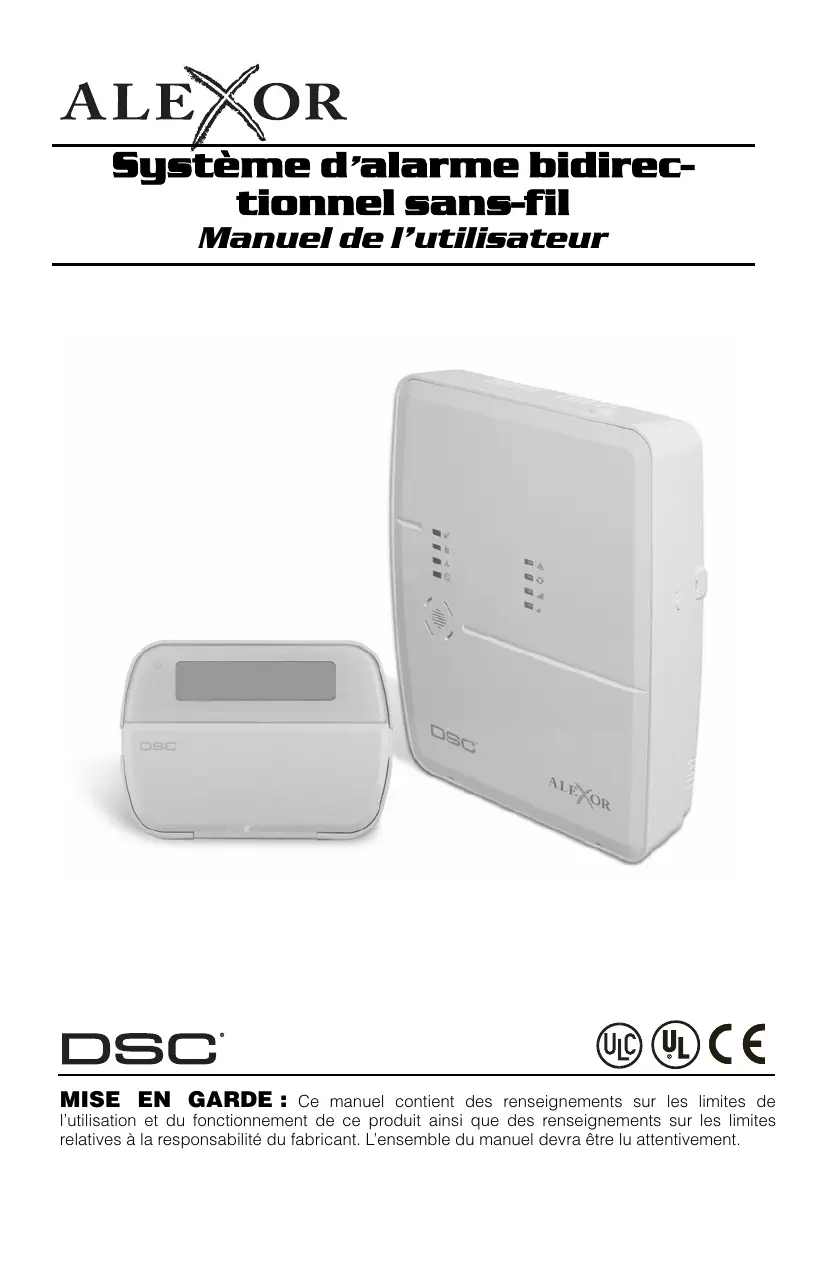 À propos de votre système de sécurité Votre système de sécurité DSC a été conçu pour vous offrir la plus grande souplesse et commodité possible. Lisez ce guide attentivement et demandez à votre installateur de vous expliquer le fonctionnement du système et de vous indiquer quelles fonctions ont été validées. Tous les utilisateurs du système devraient en connaître le fonctionnement. Remplissez la page «Renseignements sur le Système» et rangez ce guide dans un lieu sûr afin de pouvoir vous y référer. REMARQUE : Veuillez consulter votre installateur pour de plus amples renseignements sur les fonctions de réduction de fausses alarmes intégrées dans votre système et qui ne sont pas couvertes dans ce manuel. Détection d’incendie Le système est en mesure de contrôler les dispositifs de détection d’incendie tels que les détecteurs de fumée et de vous mettre en garde en cas d’incendie. La détection efficace des incendies dépend du nombre de détecteurs placés aux endroits appropriés. Le matériel de détection d’incendie devrait être installé conformément aux NFPA 72 (N.F.P.A., Batterymarch Park, Quincey MA 02269). Étudiez attentivement les directives ayant trait au Plan d’évacuation de la famille incluses dans ce guide. REMARQUE : Votre installateur doit valider les fonctions de détection d’incendie de votre système pour qu’elles soient fonctionnelles. Détection de monoxyde de carbone Votre installateur peut permettre à votre système de surveiller des détecteurs de Monoxyde de Carbone. Étudiez attentivement les directives ayant trait au Plan d’évacuation de la famille incluses dans ce guide. Remarque : Votre installateur doit valider les fonctions de détection de monoxyde de carbone de votre système pour qu’elles soient fonctionnelles. Essais Pour garantir le bon fonctionnement de votre système, il est important de le tester chaque semaine. Prenez connaissance de la section du présent guide portant sur les essais du système et suivez les instructions attentivement. Si votre système ne fonctionne pas correctement ou que vous avez des questions à propos des essais, contacter votre installateur. Télésurveilleur Ce système est capable de transmettre des alarmes, problèmes et informations d’urgence à une centrale de télésurveillance. Si vous déclenchez une alarme par erreur, communiquez immédiatement avec la centrale de télésurveillance pour empêcher toute intervention inadéquate. REMARQUE : L’installateur doit activer la fonction de surveillance pour qu’elle soit fonctionnelle. REMARQUE : Il y a un délai de communication de 30 secondes sur ce système. Il peut être retiré ou augmenté jusqu’à un maximum de 45 secondes selon les désirs de l’utilisateur en consultation avec l’installateur. Entretien Avec une utilisation normale, le système exige très peu d’entretien. Notez les éléments suivants: