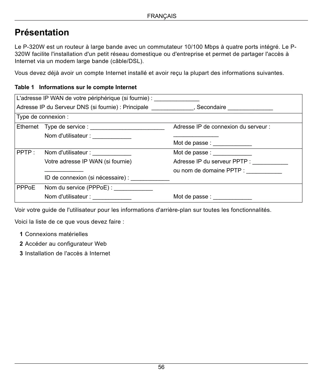 2 Accéder au configurateur Web 3 Installation de l'accès à Internet