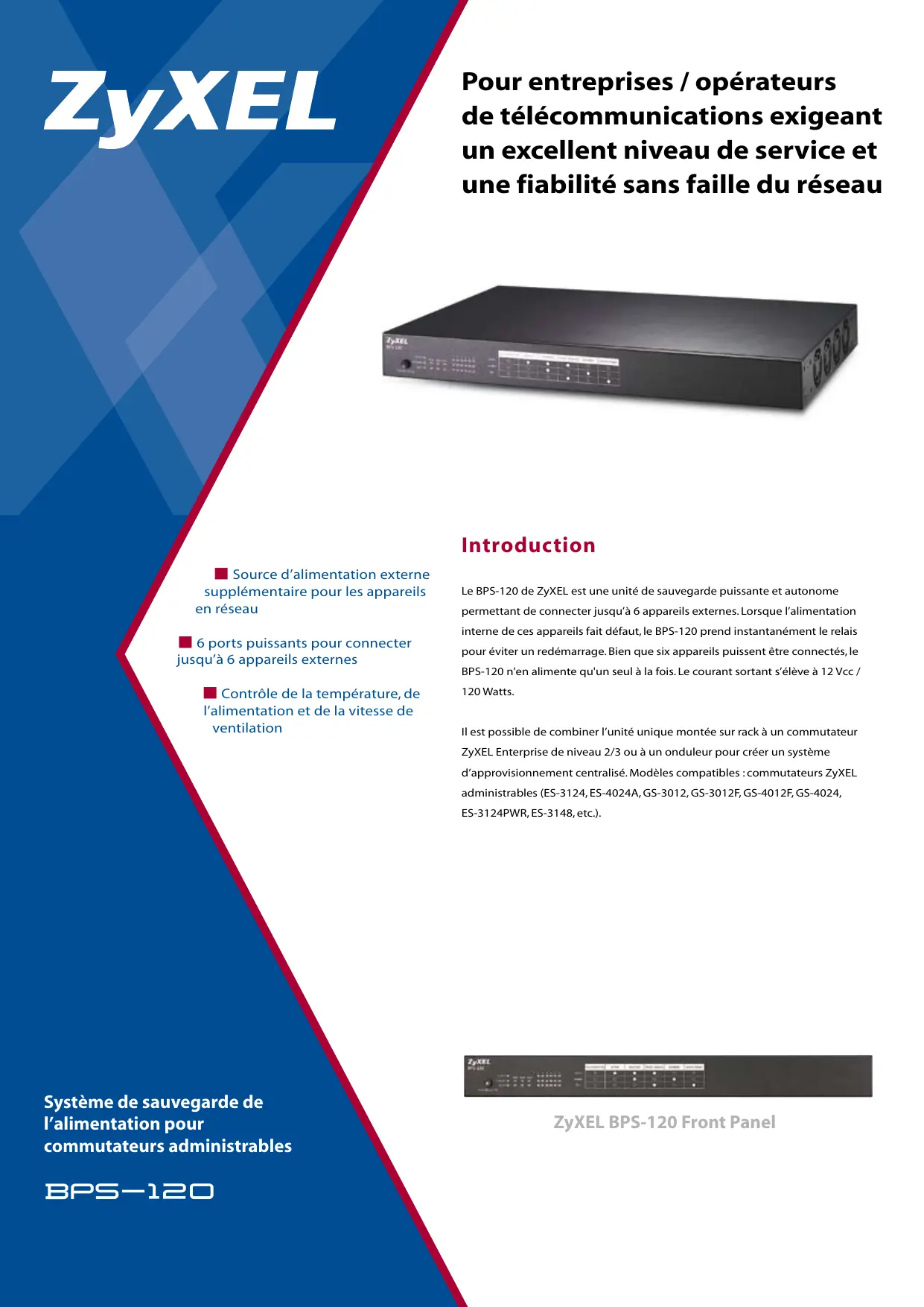 Le BPS-120 de ZyXEL est une unité de sauvégarde puissant et autonome permettant de connecter jusqu'à 6 apparèils externes. Lorsque l'alimentation interne de ces apparèils fait défaut, le BPS-120 prend instantanément le relais pour éviter un redémarrage. Bien que six apparèils puissant être connectés, le BPS-120 n'en alimente qu'un seul à la fois. Le courantSORTANT s'élevée à 12 Vcc / 120 Watts.
