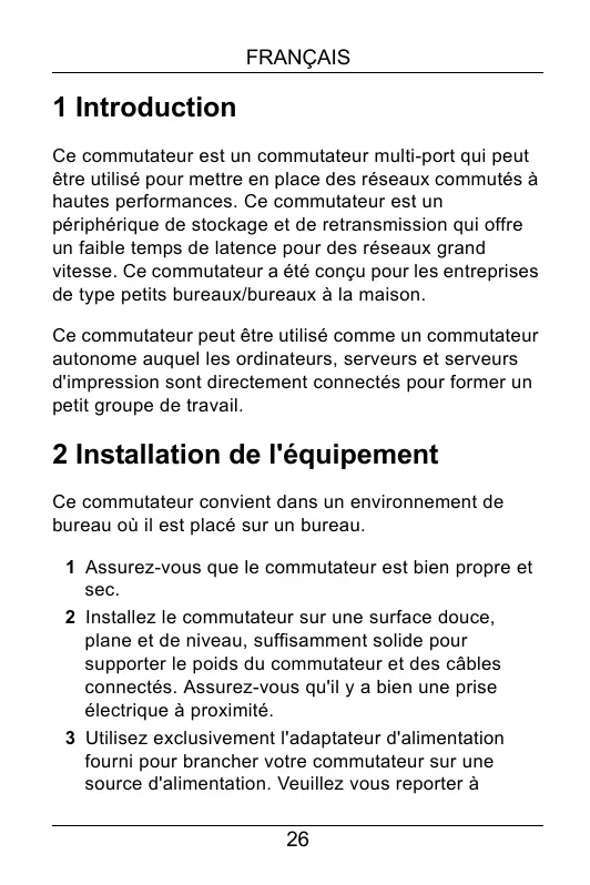 Installez le commutateur sur une surface douce, plane et de niveau, suffisamment solide pour supporter le poids du commutateur et des câbles connectés. Assurez-vous qu'il y a bien une prise électrique à proximité.