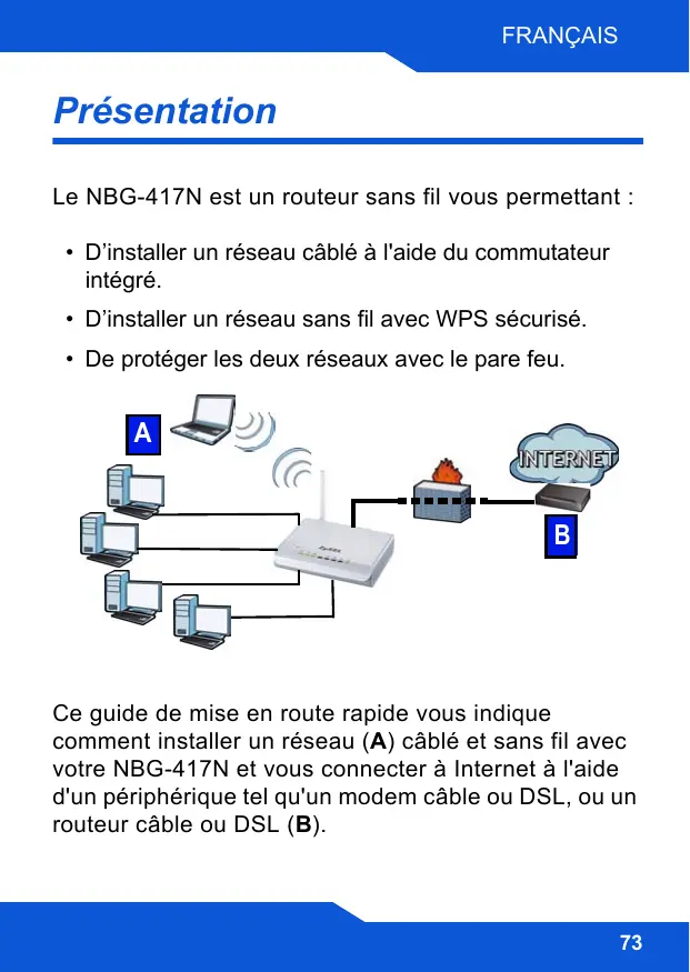 A B Ce guide de mise en route rapide vous indique comment installer un réseau (A) câblé et sans fil avec votre NBG-417N et vous connecter à Internet à l'aide d'un périphérique tel qu'un modem câble ou DSL, ou un routeur câble ou DSL (B).