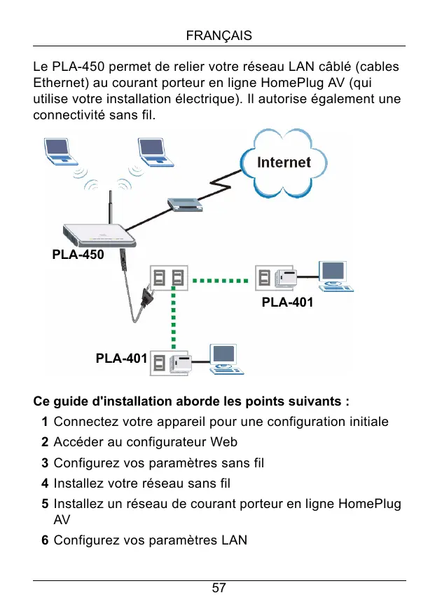 FRANÇAIS Le PLA-450 permet de relier votre réseau LAN câblé (cables Ethernet) au courant porteur en ligne HomePlug AV (qui utilise votre installation électrique). Il autorise également une connectivité sans fil.