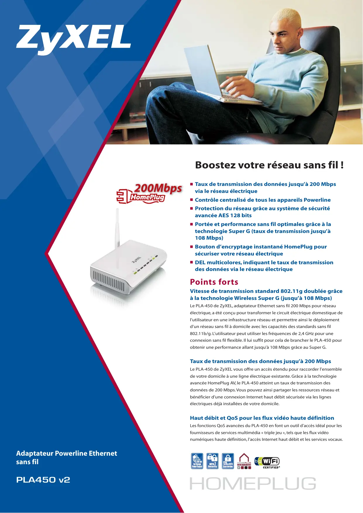 Points forts Vitesse de transmission standard 802.11g doublée grâce à la technologie Wireless Super G (jusqu’à 108 Mbps) Le PLA-450 de ZyXEL, adaptateur Ethernet sans fil 200 Mbps pour réseau électrique, a été conçu pour transformer le circuit électrique domestique de l’utilisateur en une infrastructure réseau et permettre ainsi le déploiement d’un réseau sans fil à domicile avec les capacités des standards sans fil 802.11b/g. L’utilisateur peut utiliser les fréquences de 2,4 GHz pour une connexion sans fil flexible. Il lui suffit pour cela de brancher le PLA-450 pour obtenir une performance allant jusqu’à 108 Mbps grâce au Super G.