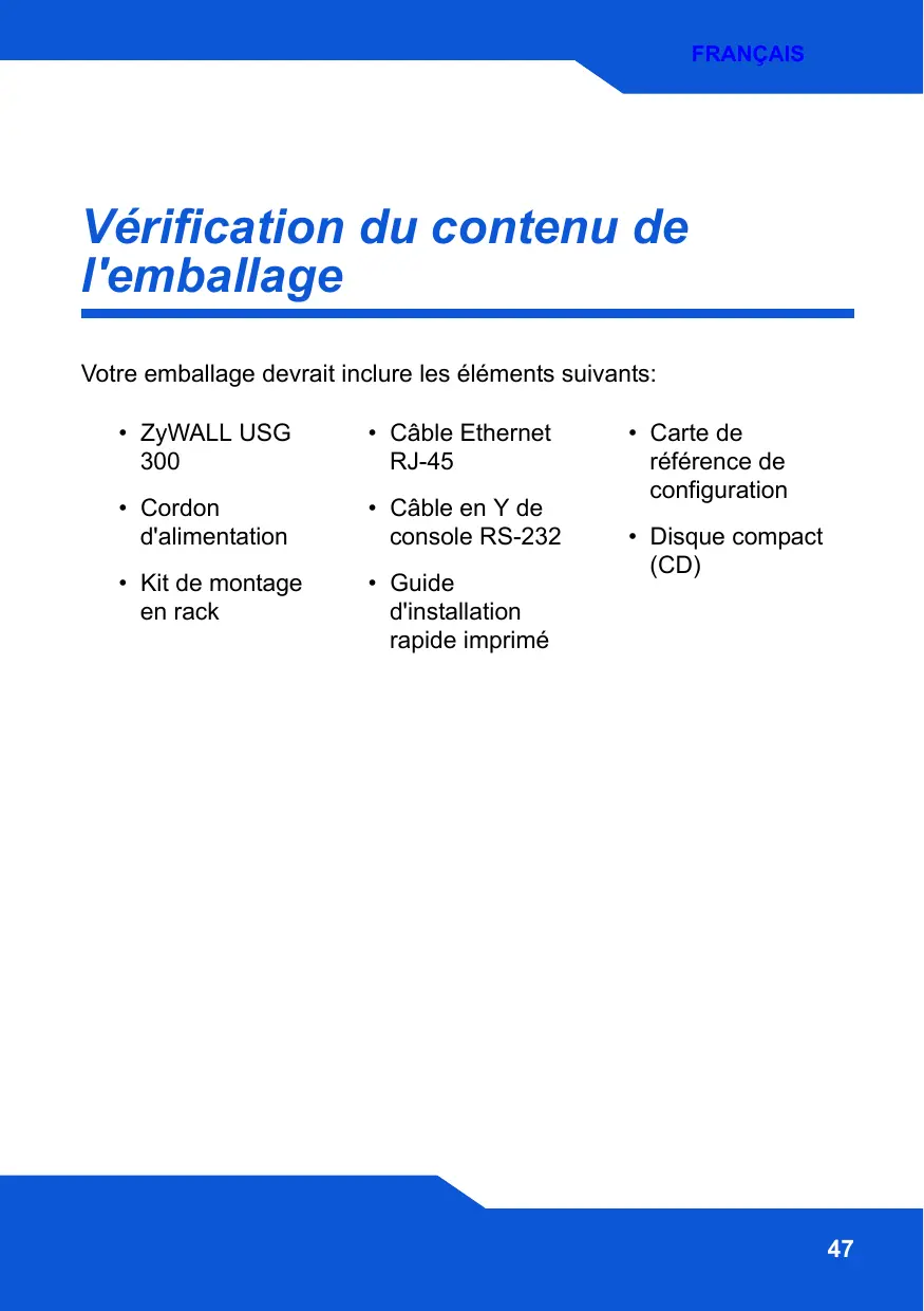 + ZyWALL USG + Câble Ethernet + Carte de 300 RJ-45 référence de + Cordon + Câble en Y de configuration d'alimentation console RS-232 + Disque compact (CD)
