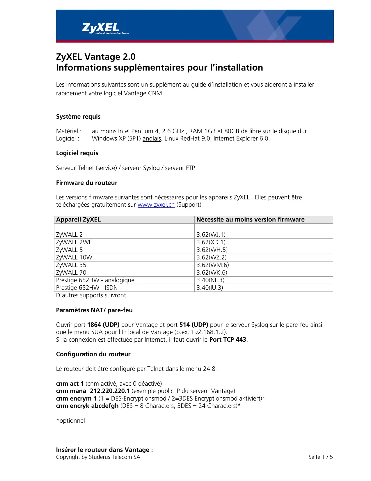 ZyXEL vantage 2.0 informations supplémentaires pour l'installation