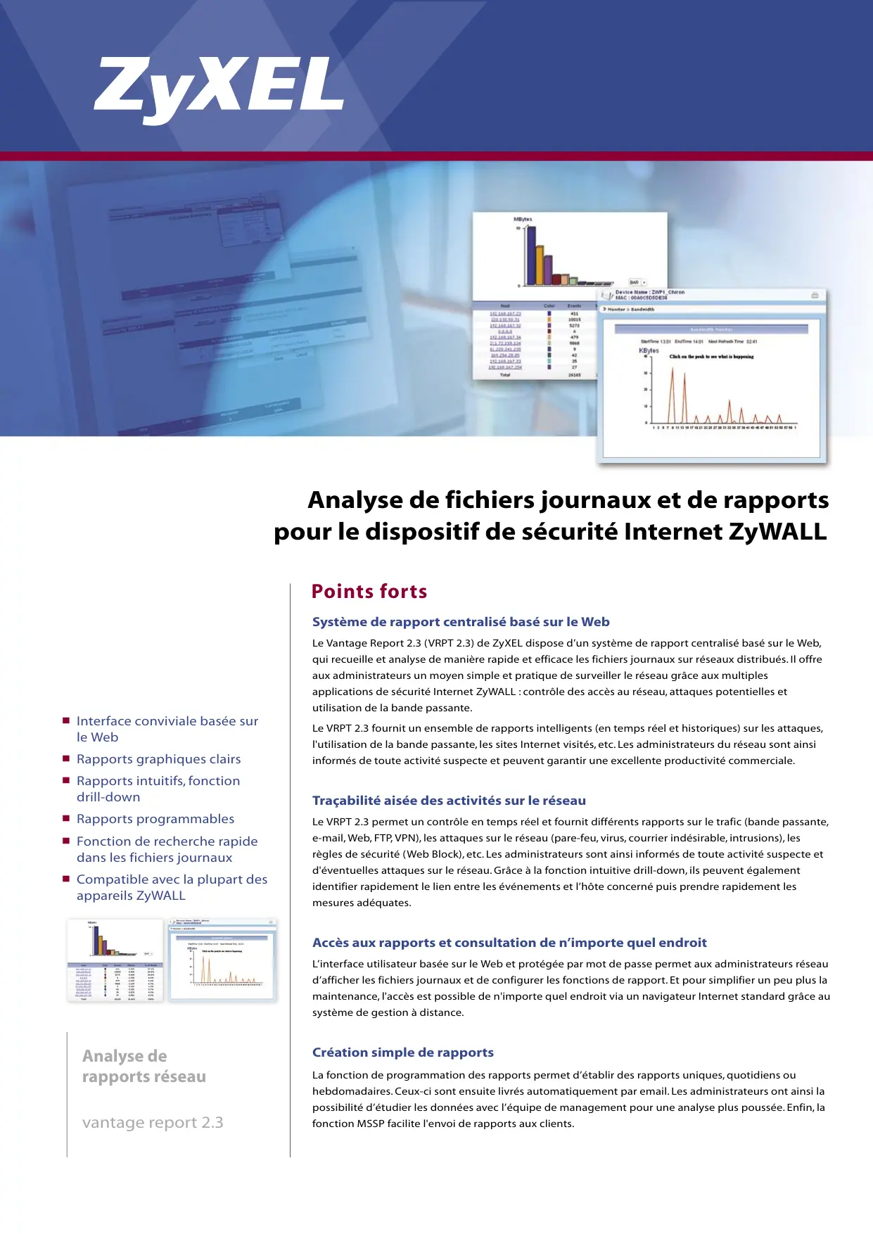 Le Vantage Report 2.3 (VRPT 2.3) de ZyXEL dispose d'un système de rapport centralisé basé sur le Web, qui recueille et analyse de manière rapide et efficace les fichiers journaux sur réseaux distribués. Il offre aux administrateurs un moyen simple et pratique de surveiller le réseau grâce aux multiples applications de sécurité Internet ZyWALL : contrôle des accès au réseau, attaques potentielles et utilisation de la bande passante.