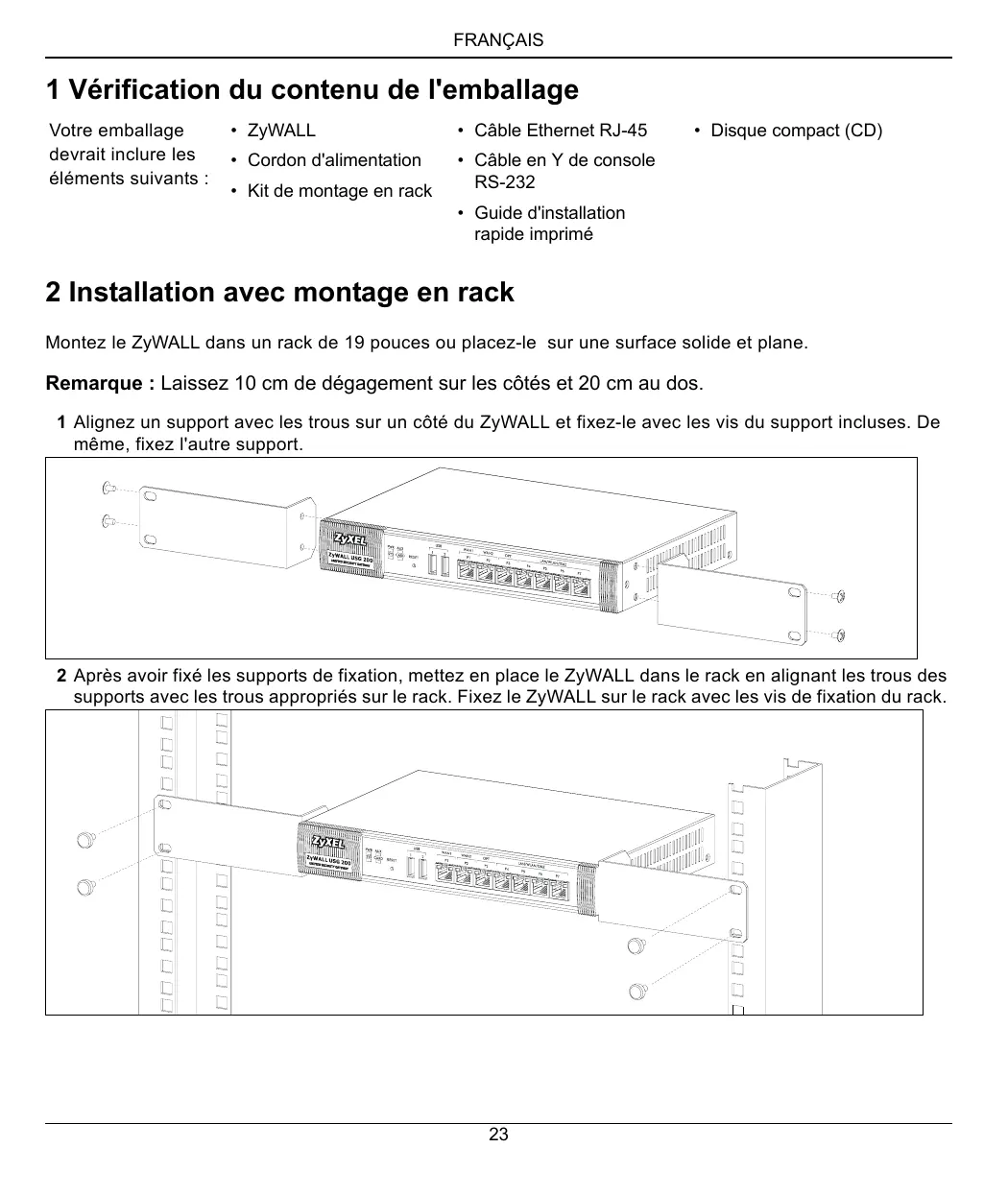 - Guide d'installation rapide imprimé 2 Installation avec montage en rack Montez le ZyWALL dans un rack de 19 pouces ou placez-le sur une surface solide et plane. Remarque : Laissez 10 cm de dégagement sur les côtés et 20 cm au dos. 1 Alignez un support avec les trous sur un côté du ZyWALL et fixez-le avec les vis du support incluses. De même, fixez l'autre support. 2 Après avoir fixé les supports de fixation, mettez en place le ZyWALL dans le rack en alignant les trous des supports avec les trous appropriés sur le rack. Fixez le ZyWALL sur le rack avec les vis de fixation du rack.