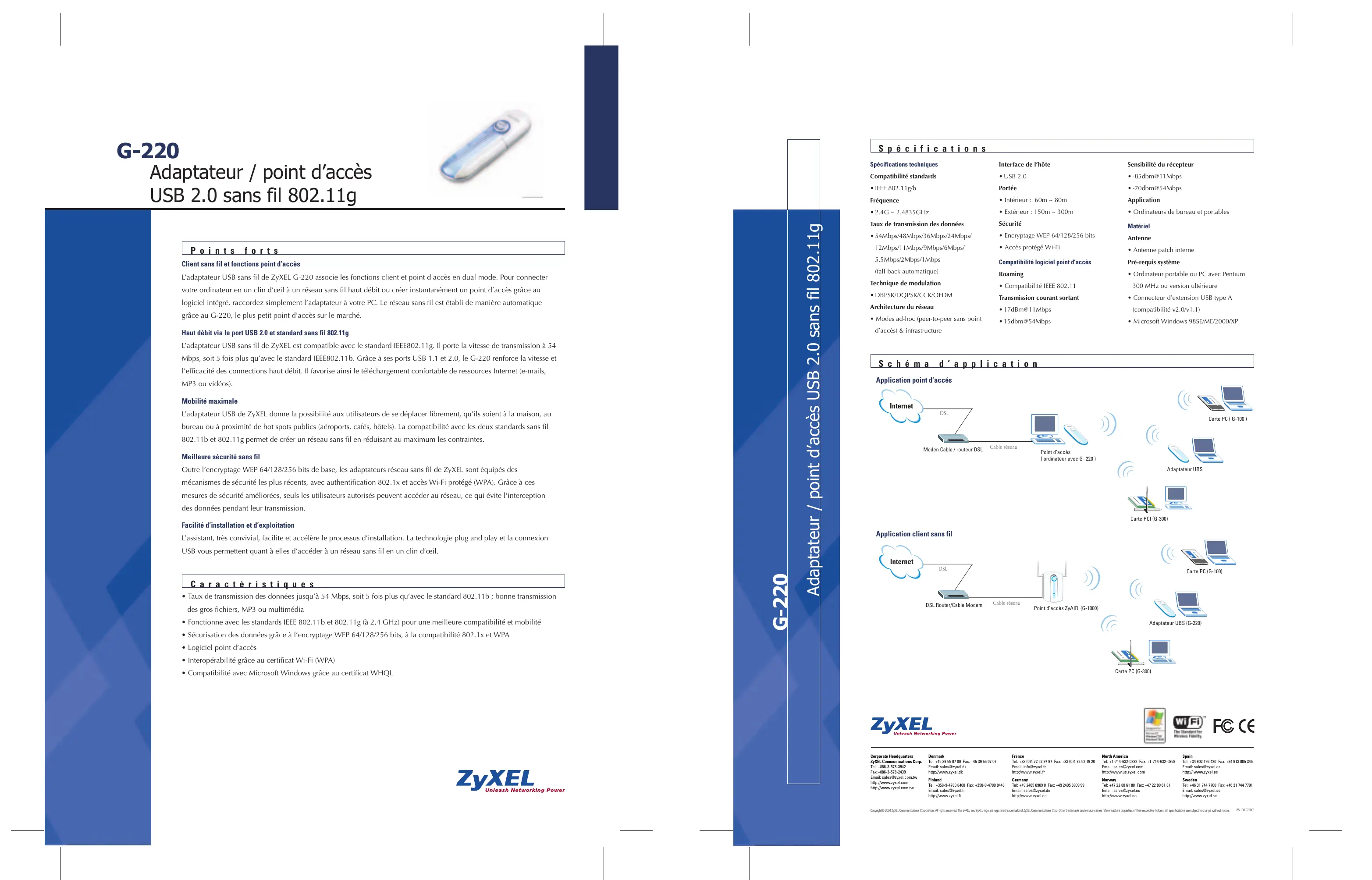 Client sans fil et fonctions point d’accès L’adaptateur USB sans fil de ZyXEL G-220 associe les fonctions client et point d'accès en dual mode. Pour connecter votre ordinateur en un clin d’œil à un réseau sans fil haut débit ou créer instantanément un point d’accès grâce au logiciel intégré, raccordez simplement l’adaptateur à votre PC. Le réseau sans fil est établi de manière automatique grâce au G-220, le plus petit point d'accès sur le marché. Haut débit via le port USB 2.0 et standard sans fil 802.11g L’adaptateur USB sans fil de ZyXEL est compatible avec le standard IEEE802.11g. Il porte la vitesse de transmission à 54 Mbps, soit 5 fois plus qu’avec le standard IEEE802.11b. Grâce à ses ports USB 1.1 et 2.0, le G-220 renforce la vitesse et l’efficacité des connections haut débit. Il favorise ainsi le téléchargement confortable de ressources Internet (e-mails, MP3 ou vidéos). Mobilité maximale L’adaptateur USB de ZyXEL donne la possibilité aux utilisateurs de se déplacer librement, qu’ils soient à la maison, au bureau ou à proximité de hot spots publics (aéroports, cafés, hôtels). La compatibilité avec les deux standards sans fil 802.11b et 802.11g permet de créer un réseau sans fil en réduisant au maximum les contraintes. Meilleure sécurité sans fil Outre l’encryptage WEP 64/128/256 bits de base, les adaptateurs réseau sans fil de ZyXEL sont équipés des mécanismes de sécurité les plus récents, avec authentification 802.1x et accès Wi-Fi protégé (WPA). Grâce à ces mesures de sécurité améliorées, seuls les utilisateurs autorisés peuvent accéder au réseau, ce qui évite l'interception des données pendant leur transmission. Facilité d’installation et d’exploitation L’assistant, très convivial, facilite et accélère le processus d’installation. La technologie plug and play et la connexion