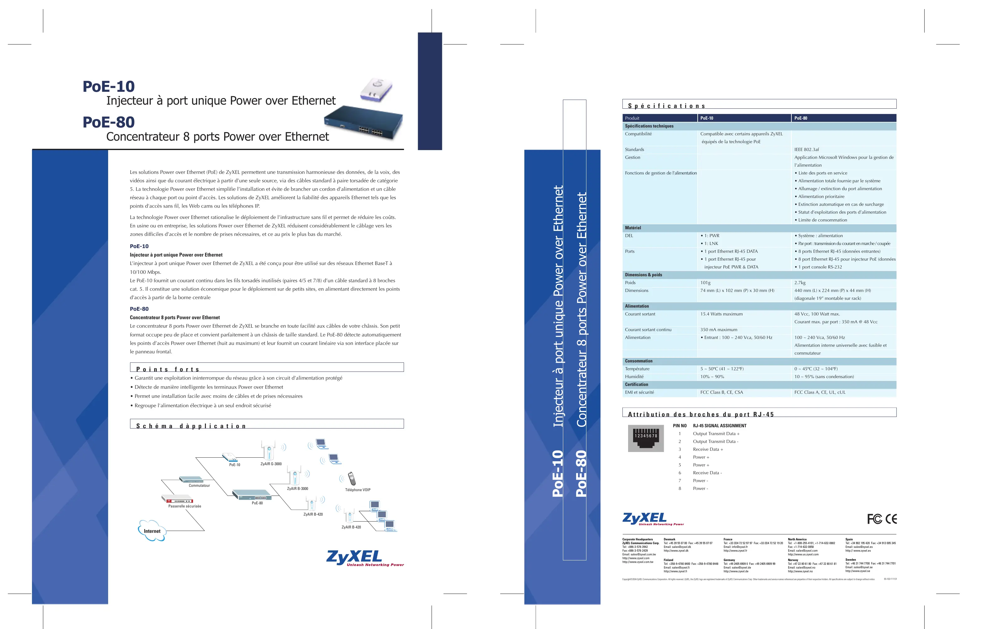 Les solutions Power over Ethernet (PoE) de ZyXEL permettent une transmission harmonieuse des données, de la voix, des videos ainsi que du courant électrique à partir d'une seule source, via des cables standard à paire torsadée de catégorie 5. La technologie Power over Ethernet simplifie l'installation et évite de brancher un cordon d'alimentation et un cable réseau à chaque port ou point d'accès. Les solutions de ZyXEL améliorent la fiabilité des appareils Ethernet tels que les points d'accès sans fil, les Webcams ou les téléphones IP.