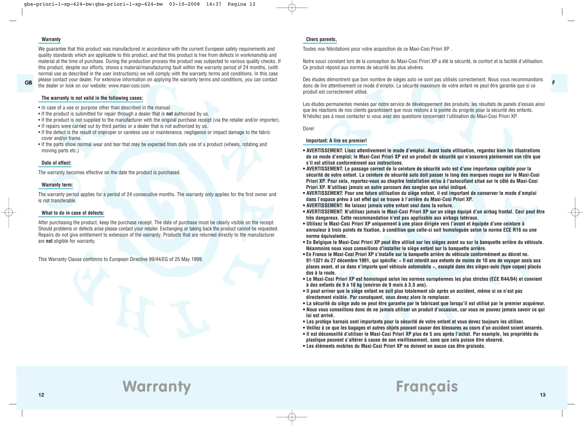 + AVERTISSEMENT: Lisez attentivement le mode d'emploi. Avant toute utilisation, regardez bien les illustrations de ce mode d'emploi; le Maxi-Cosi Priori XP est un produit de sécurité qui n’assurera pleinement son rôle que s’il est utilisé conformément aux instructions.