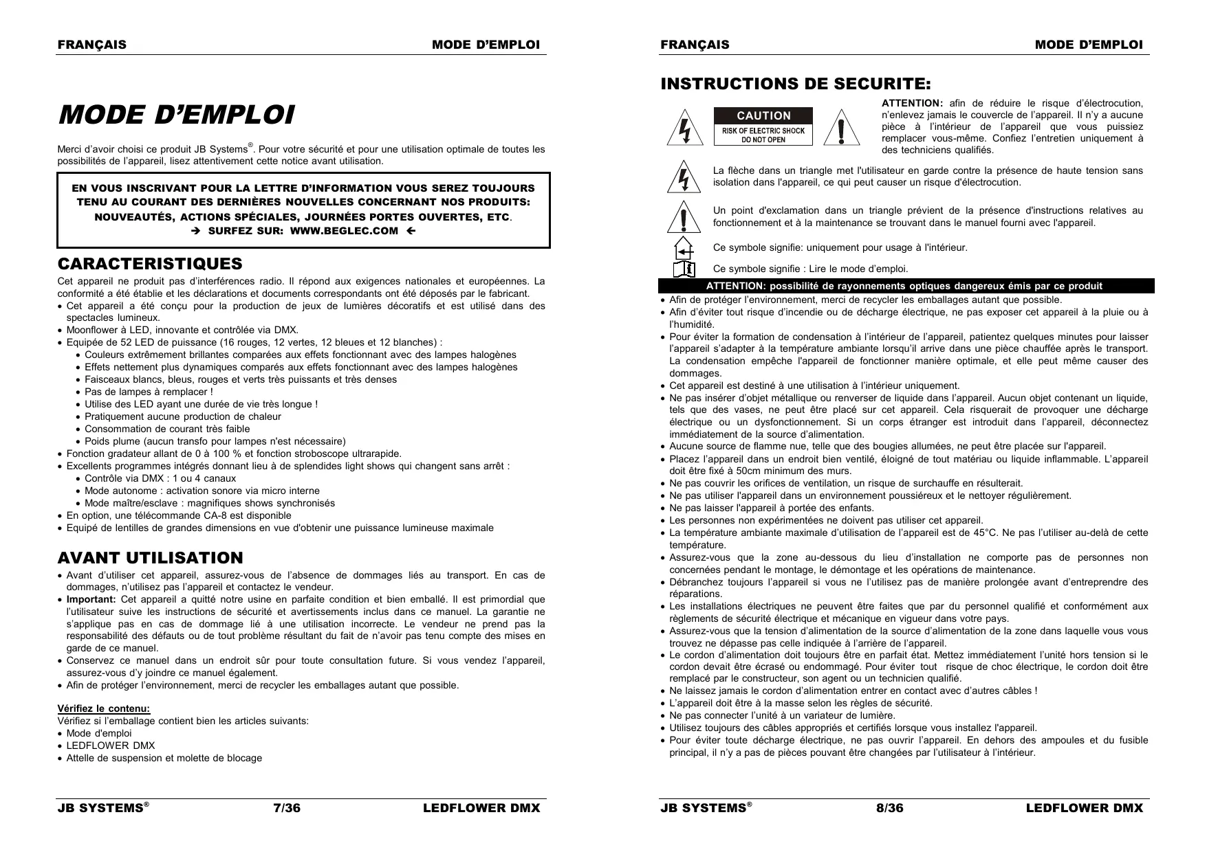 Merci d’avoir choisi ce produit JB Systems . Pour votre sécurité et pour une utilisation optimale de toutes les possibilités de l’appareil, lisez attentivement cette notice avant utilisation. La flèche dans un triangle met l'utilisateur en garde contre la présence de haute tension sans isolation dans l'appareil, ce qui peut causer un risque d'électrocution. Un point d'exclamation dans un triangle prévient de la présence d'instructions relatives au fonctionnement et à la maintenance se trouvant dans le manuel fourni avec l'appareil. Ce symbole signifie: uniquement pour usage à l'intérieur. CARACTERISTIQUES Ce symbole signifie : Lire le mode d’emploi. Cet appareil ne produit pas d’interférences radio. Il répond aux exigences nationales et européennes. La conformité a été établie et les déclarations et documents correspondants ont été déposés par le fabricant. Cet appareil a été conçu pour la production de jeux de lumières décoratifs et est utilisé dans des spectacles lumineux. Moonflower à LED, innovante et contrôlée via DMX. Equipée de 52 LED de puissance (16 rouges, 12 vertes, 12 bleues et 12 blanches) : Couleurs extrêmement brillantes comparées aux effets fonctionnant avec des lampes halogènes Effets nettement plus dynamiques comparés aux effets fonctionnant avec des lampes halogènes Faisceaux blancs, bleus, rouges et verts très puissants et très denses Pas de lampes à remplacer ! Utilise des LED ayant une durée de vie très longue ! Pratiquement aucune production de chaleur Consommation de courant très faible Poids plume (aucun transfo pour lampes n'est nécessaire) Fonction gradateur allant de 0 à 100 % et fonction stroboscope ultrarapide. Excellents programmes intégrés donnant lieu à de splendides light shows qui changent sans arrêt : Contrôle via DMX : 1 ou 4 canaux Mode autonome : activation sonore via micro interne Mode maître/esclave : magnifiques shows synchronisés En option, une télécommande CA-8 est disponible Equipé de lentilles de grandes dimensions en vue d'obtenir une puissance lumineuse maximale AVANT UTILISATION