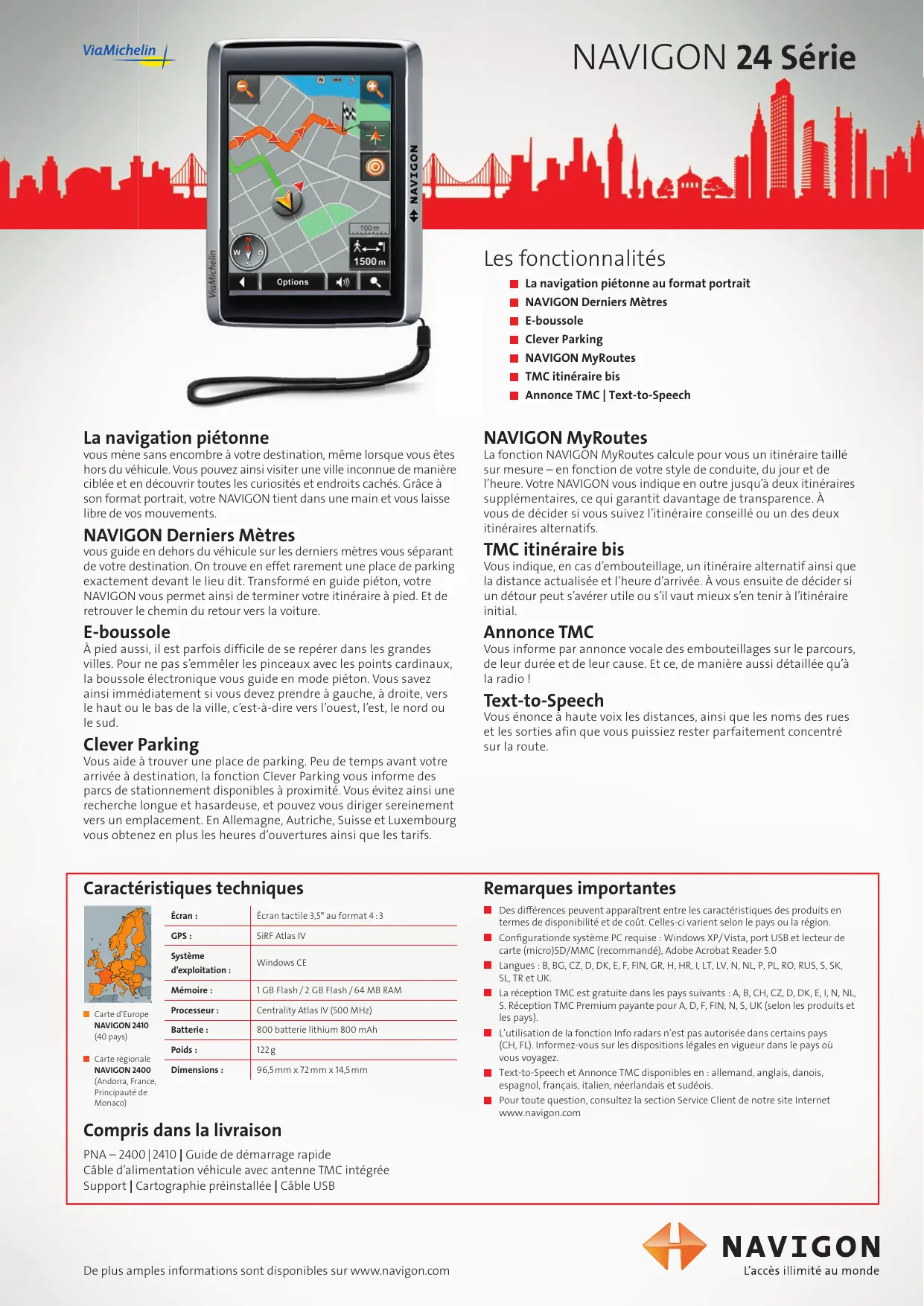 La navigation piétonne vous mène sans encombre à votre destination, même lorsque vous êtes hors du véhicule. Vous pouvez ainsi visiter une ville inconnue de manière ciblée et en découvrir toutes les curiosités et endroits cachés. Grâce à son format portrait, votre NAVIGON tient dans une main et vous laisse libre de vos mouvements. NAVIGON Derniers Mètres vous guide en dehors du véhicule sur les derniers mètres vous séparant de votre destination. On trouve en effet rarement une place de parking exactement devant le lieu dit. Transformé en guide piéton, votre NAVIGON vous permet ainsi de terminer votre itinéraire à pied. Et de retrouver le chemin du retour vers la voiture. E-boussole À pied aussi, il est parfois difficile de se repérer dans les grandes villes. Pour ne pas s'emmêler les pinceaux avec les points cardinaux, la boussole électronique vous guide en mode piéton. Vous savez ainsi immédiatement si vous devez prendre à gauche, à droite, vers le haut ou le bas de la ville, c'est-à-dire vers l'ouest, l'est, le nord ou le sud Clever Parking Vous aide à trouver une place de parking. Peu de temps avant votre arrivée à destination, la fonction Clever Parking vous informe des parcs de stationnement disponibles à proximité. Vous évitez ainsi une recherche longue et hasardeuse, et pouvez vous diriger sereinement vers un emplacement. En Allemagne, Autriche, Suisse et Luxembourg vous obtenez en plus les heures d'ouvertures ainsi que les tarifs. NAVIGON 24 Série Les fonctionnalités M La navigation piétonne au format portrait m NAVIGON Derniers Mètres m E-boussole M Clever Parking m NAVIGON MyRoutes m TMCitinéraire bis m Annonce TMC | Text-to-Speech NAVIGON MyRoutes La fonction NAVIGON MyRoutes calcule pour vous un itinéraire taillé sur mesure — en fonction de votre style de conduite, du jour et de l'heure. Votre NAVIGON vous indique en outre jusqu'à deux itinéraires supplémentaires, ce qui garantit davantage de transparence. À vous de décider si vous suivez l'itinéraire conseillé ou un des deux itinéraires alternatifs TMCitinéraire bis Vous indique, en cas d'embouteillage, un itinéraire alternatif ainsi que la distance actualisée et l'heure d'arrivée. À vous ensuite de décider si un détour peut s'avérer utile ou s'il vaut mieux s'en tenir à l'itinéraire initial. Annonce TMC Vous informe par annonce vocale des embouteillages sur le parcours, de leur durée et de leur cause. Et ce, de manière aussi détaillée qu'à la radio! Text-to-Speech Vous énonce à haute voix les distances, ainsi que les noms des rues et les sorties afin que vous puissiez rester parfaitement concentré sur la route. Caractéristiques techniques Écran : Écran tactile 3,5" au format :3 Gps: SIRF Atlas SEE Windows CE d'exploitation : Mémoire : GB Flash/2 GB Flash /64 MB RAM m Carte dturope Processeur + Centrality Atlas IV (500 MHz) NAVIGON 2410 | Batterie : 800 batterie lithium 800 mAh {40 pays) Poids : 128 M Carte régionale NAVIGON 2400 Dimensic 96,5mm x 72mm x 145mm {andorra, France, Principauté de Monaco) Compris dans la livraison PNA — 2400 | 2410 | Guide de démarrage rapide Cäble d'alimentation véhicule avec antenne TMC intégrée Support | Cartographie préinstallée | Câble USB Remarques importantes M Des différences peuvent apparaîtrent entre les caractéristiques des produits en termes de disponibilité et de coût. Celles-ci varient selon le pays ou la région. M Configurationde système PC requise : Windows XP/ Vista, port USB et lecteur de carte (micro)SD/MMC (recommandé), Adobe Acrobat Reader 5.0 M Langues :B, BG, CZ, D,DKE,F, FIN, GR, H, HR, L LT, LV, N, NL, P, PL, RO, RUS, S, SK, SL TR et UK M La réception TMC est gratuite dans les pays suivants : A, B, CH, CZ, D, DK,E,I,N, NL, S. Réception TMC Premium payante pour À, D, F, FIN, N,S, UK (selon les produits et les pays). L'utilisation de la fonction Info radars n'est pas autorisée dans certains pays (CH, FL). Informez-vous sur les dispositions légales en vigueur dans le pays où vous voyagez M Text-to-Speech et Annonce TMC disponibles en : allemand, anglais, danois, espagnol, français, italien, néerlandais et sudéois. Pour toute question, consultez la section Service Client de notre site Internet wwa:navigon.com De plus amples informations sont disponibles sur wwwnavigon.com NAVIGON L'accès illimité au monde