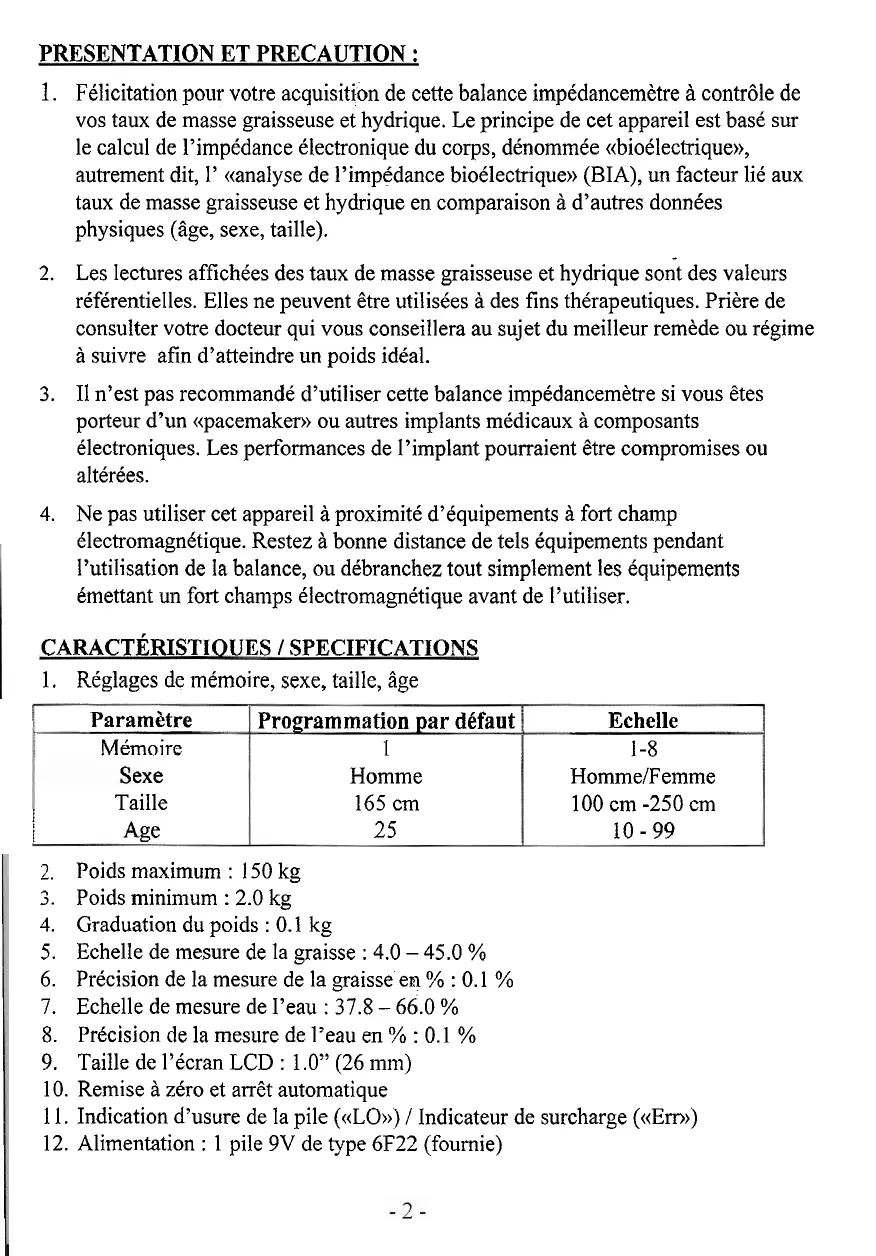 - Il n'est pas recommandé d'utiliser cette balance impédancemètre si vous étés porteur d'un «pacemaker» ou autres implants Médicaux à composants électroniques. Les performances de l'implant pourraient être compromisesés ou alterées.